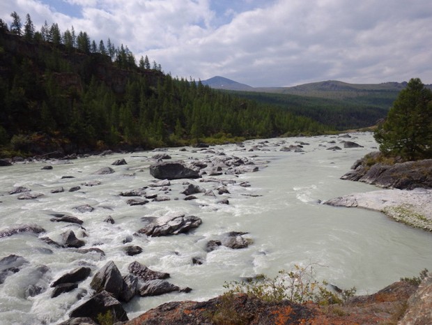 Обнос и просмотр занял 1,5 часа. Дособирали вещи и в 11.05 отчалили. Река спокойная, сильно меандрирует, течение очень слабое. До слияния с Джазатором шли час. Дальше река уходит в сторону от поселка, обходя утес. Зачалились после впадения Джазатора, достали мой телефон и созвонились с Альбертом (с которым договаривались насчет проживания на базе «Кабарга» и о заброске на лошадях). Еще раз уточнили у него, где находится база. Он объяснил, что база ниже по течению, за горой. Поплыли дальше. Прошли пару перекатов уже на Аргуте и километра через 4, в устье р. Бара обнаружили базу.