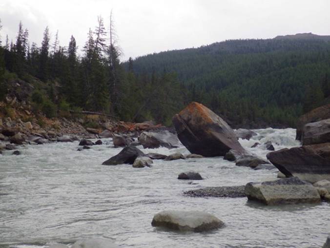 Встали в 7.30. Погода хорошая. Вышли в 10.30. Через 15 минут сплава первая шивера, простая. За ней участок быстротока и шивера с большим камнем на выходе (преп. 18). За ней прогон и впереди видно падение и камни в русле – предположительно порог «Туз». Зачалились на правый берег (это было ошибкой). Ходить там очень неудобно, тайга завалена бревнами, вдоль берега крупные камни. Это был