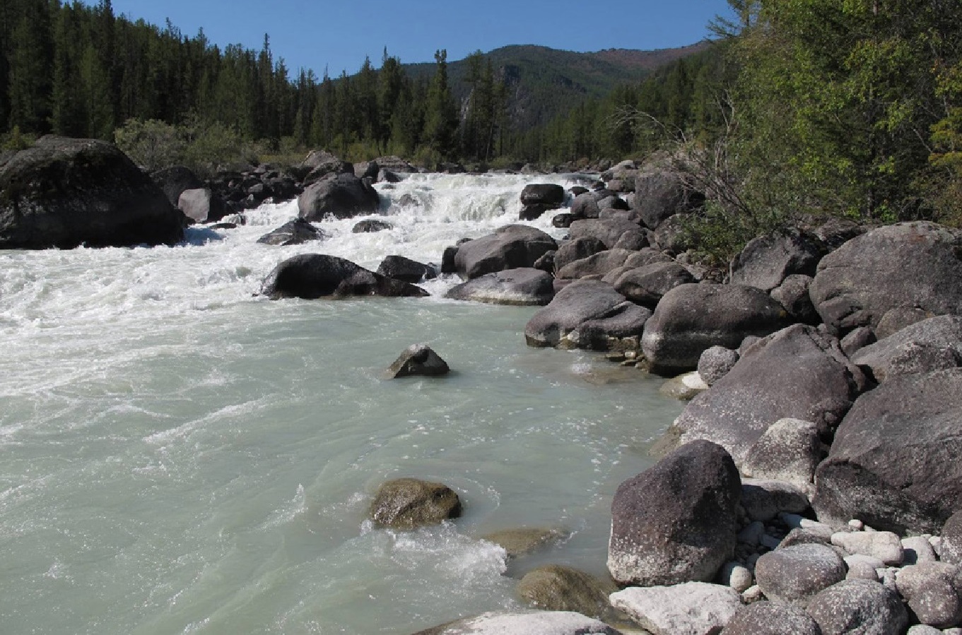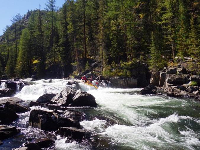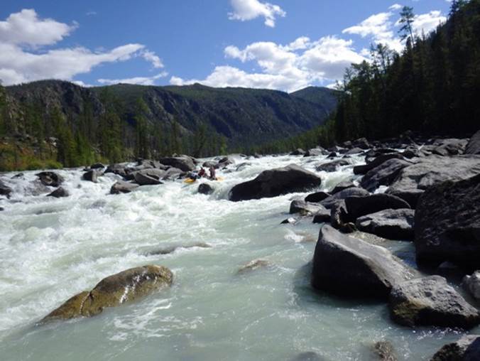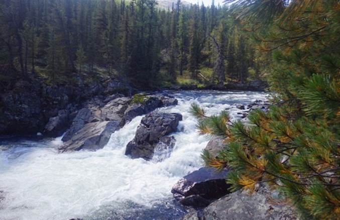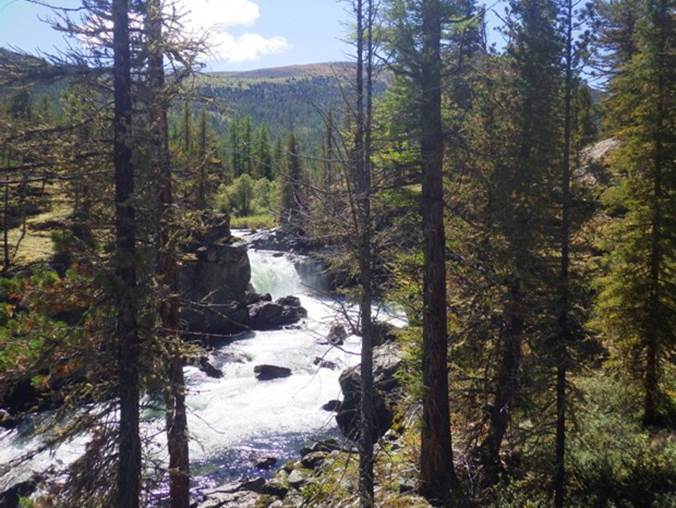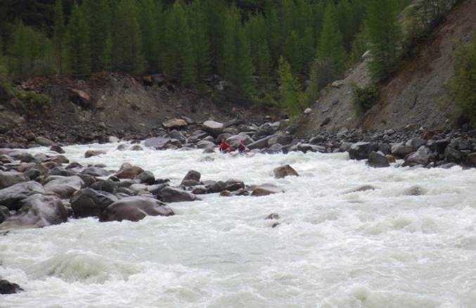 Преп. 3 – порог длиной 70 м. У ПБ надводные камни. Порог менее мощный, чем преп. 2. Через 20 мин. сплава слева от распадка незаметно впадает р. Байбкунь.