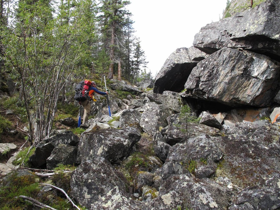 После брода тропа поднимается по курумнику наверх, обходя 4-ый каньон Кара-Алахи. Лошади ушли вперед, за ними мы с Женей. Георгич и Серега отстали на подъеме. Тропа поднимается наверх и выходит на каменный «лоб». На край каньона тропа не выходит, поэтому я специально в нескольких местах подходила посмотреть, что видно внизу. Видно плохо – высоко и закрывают скальные выступы и деревья. Тропа идет поверху, затем постепенно спускается вниз и возвращается к реке, виден заход в каньон, а затем уходит от реки в сторону и идет по каменной осыпи. Вдоль реки – болото. После осыпи выходит на луговину. У меня обход каньона занял около 30 минут. На луговине мы остановились подождать Георгича и Серегу.
