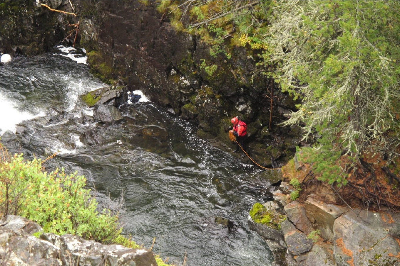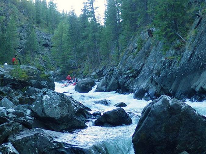 Дальше река идет в узком скальном коридоре, сливаясь через несколько гряд камней. Спуститься к воде (и поставить страховку) можно только перед четвертой ступенью каньона, на левом повороте. Чалка возможно на камнях у правого берега. Там же я поставила «спасконец» и заодно выполняла роль сигнальщика и страховщика на чалке. Первыми прошли Георгич с Серегой, благополучно выехали на камни. Катамаран вытащили на берег. Затем Георгич прошел с Женей. Кат расклинили на камнях, где зачалились. На берегу уже не было места.