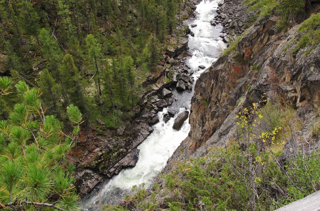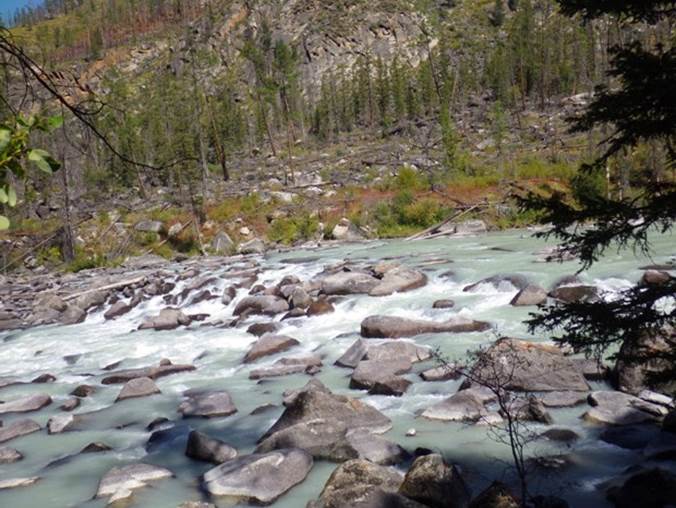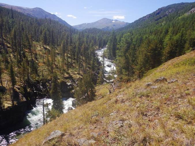 Прошли впадение р. Байжигит – первый ориентир ущелья. Водопад слышен издалека, но виден плохо. Вставать там негде – густая тайга и болото. Зато много черной смородины. Постояли и поели ягод. Пошли дальше. По берегам тоже замусоренная тайга. Кроме того, хотелось встать недалеко от чистой воды, чтобы не пить воду из реки.