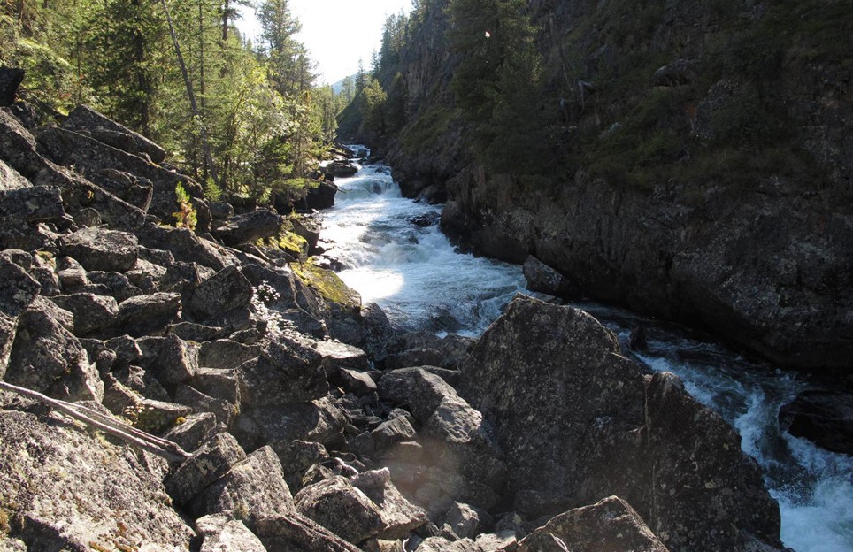 Посмотрели четвертую ступень – по правому берегу можно пролезть по скалам. В нашу воду это каменный завал с узкими проходами и навалами на камни. За этой ступенью каньон расширяется и река выполаживается. По левому берегу к самой воде подходит тропа. У правого берега