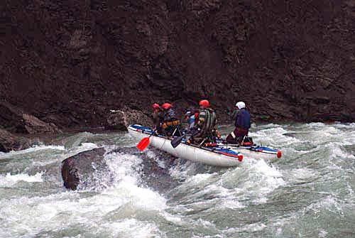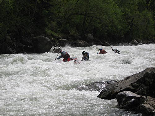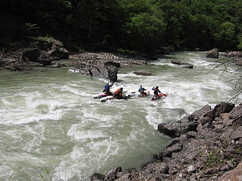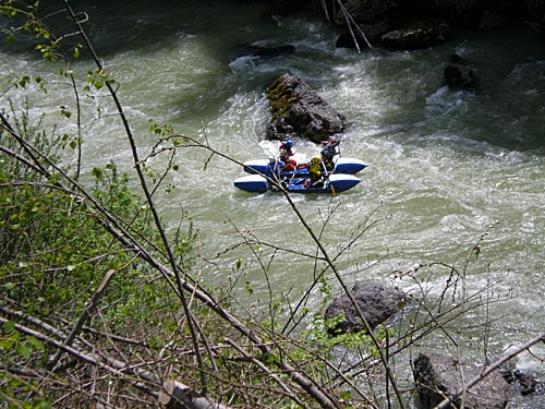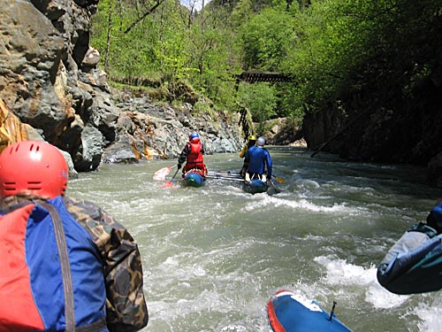 Уровень воды в реке выше среднего. Ориентиром входа в каньон служит скальное сужение и уход автодороги от реки наверх по правому берегу. Место встречи с машинами было намечено за каньоном у поваленного моста. Вошли в каньон походной колонной перечаливаясь в крупных уловах по правому берегу. Струя мощная, но широкая – есть место для маневра. Проблем с зачаливанием особых не было. В середине каньона зачалившись под правым берегом с крупнокаменистой осыпи осмотрели дальнейший путь. Проблем не предвиделось, однако решено было пройти попарно и перечалиться на левом берегу перед выходом из каньона. Сначала прошли двойки , следом четверки.