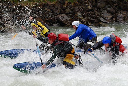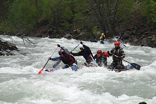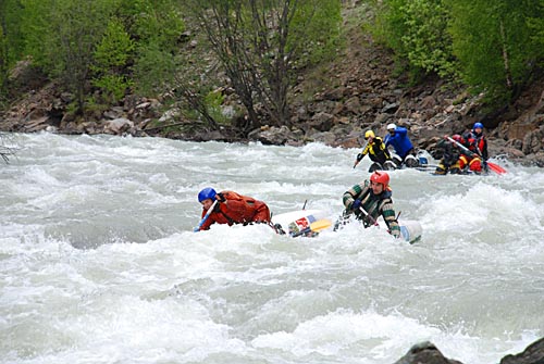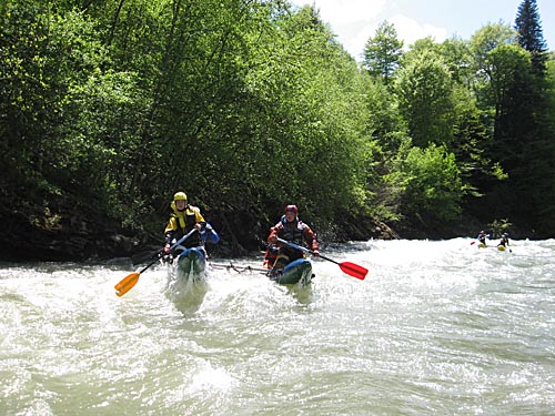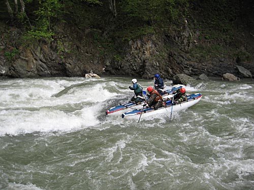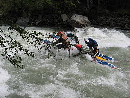 3. На двойке в составе опытного напарника участники даже с минимальным опытом( 1-2к.с.) гораздо быстрее адаптируются к сплаву по белой воде и более стремительно растут в техническом плане не нарушая принципов безопасности сплава по бурной воде. На четырехместном катамаране огромная роль отводится носовым гребцам, от капитана судна требуется грамотный выбор линии движения. Успешный сплав на четырехместном катамаране-результат совместной работы всего экипажа.