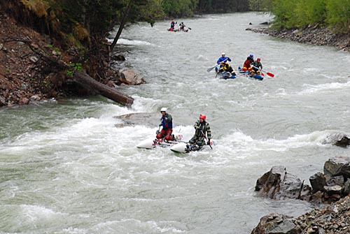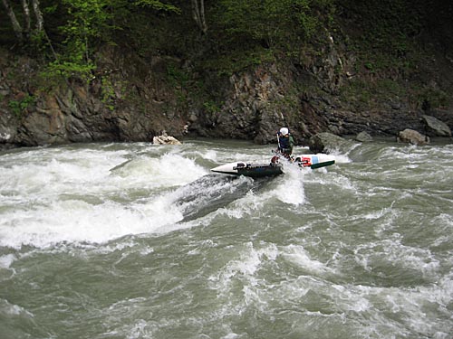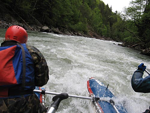 8.05 Сбор лагеря был уже отработан и составил 2 часа. Еще раз встреча с коллективом Махляева «Мир приключений«. Сплав планировалось осуществить, как и на р.Кубань, всей группой одновременно. Машины шли по берегу до оговоренного места встречи на первом мосту. Отчалив от лагеря через 200 метров провели докачку судов. Участок реки до четвертого каньона относится ко 2 к.с. Река временами делится на разбои. Время сплава до начала каньона порядка 20 минут. Перед началом каньона зачалились на правом берегу. Впереди видно сужение русла. По левому берегу высокие ели и впадающий ручей. Проведена поэкипажная сьемка. Длина каньона около 1.5км. Каньон характеризуется прижимами, мощными валами в скальных сужениях.