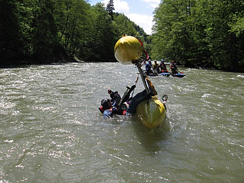 | Пушка | 3-4 вода средняя- высокая | 1000 | 10 мин от 2ого Взрывного.1ая ступень заход под правым берегом через 200-300 метров после 2ого взрывного, далее смещались влево. 2ая основная ступень – валы, бочки( в центре под водой обломки металла). 3я ступень – основной проход под левым берегом, при большей воде открывается проход под правым берегом. | Шли по основной струе, пробивая валы и бочки преимущественно под правым берегом. Взаимостраховка. |