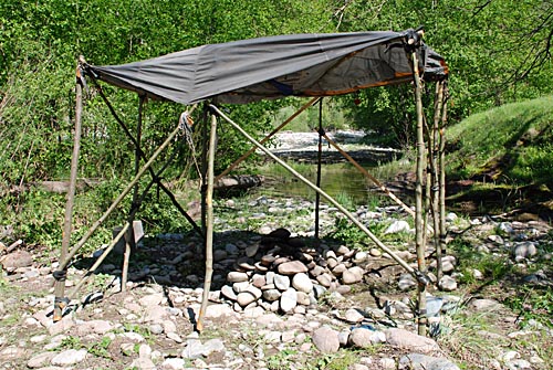 За 15 минут закончили прохождение каньона. Река очень живописна. По берегам стоят вековые ели, а с берегов впадают ручьи водопадного типа. В Рожкао встретились с машинами в районе автомоста и продолжили сплав до лагеря 20 минут. Чалка справа. Вечером все единодушно решили сделать баню, благо тентов хватало. 1 час ушел на постройку каменки и ее разжигание.