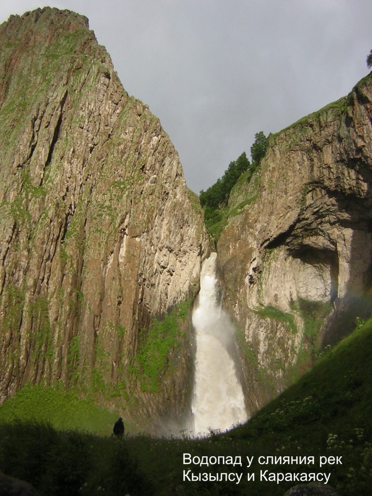 Первый радиальный выход сделали в нижний каньон к водопадам. Туда от кемпинга ведёт вначале дорога (1 км), а в самом ущелье – тропа (ещё 1 км). По пути встречаются источники нарзана. Сброс высоты до нижнего Большого водопада – около 200 м.