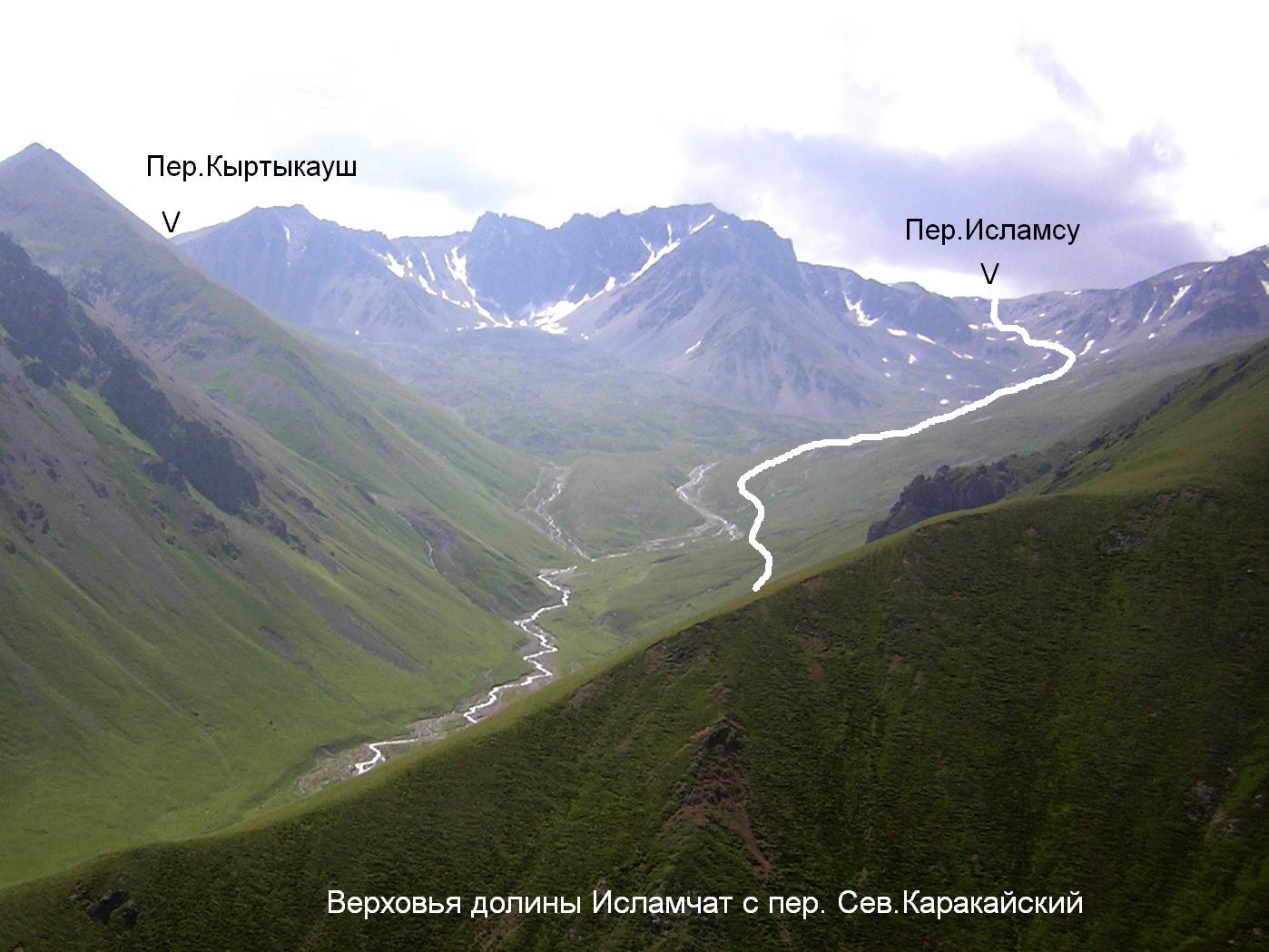 Перевал Исламсу хорошо просматривается из долины Исламчата практически точно на юге, замыкает её верховья. Продолжаем движение по тропе левым берегом, проходим место, где сливаются, образуя Исламчат, три ручья, берущие начало под перевалами Кыртыкауш, Исламсу и Южный Каракайский. Переправляемся по камням через последний и проходим по тропе с достаточно плавным набором высоты еще около 3 км (40 мин.) в направлении перевала. Здесь, в широкой и пологой части долины организуем стоянку, поскольку выше склоны становятся круче и ровных площадок не просматривается.