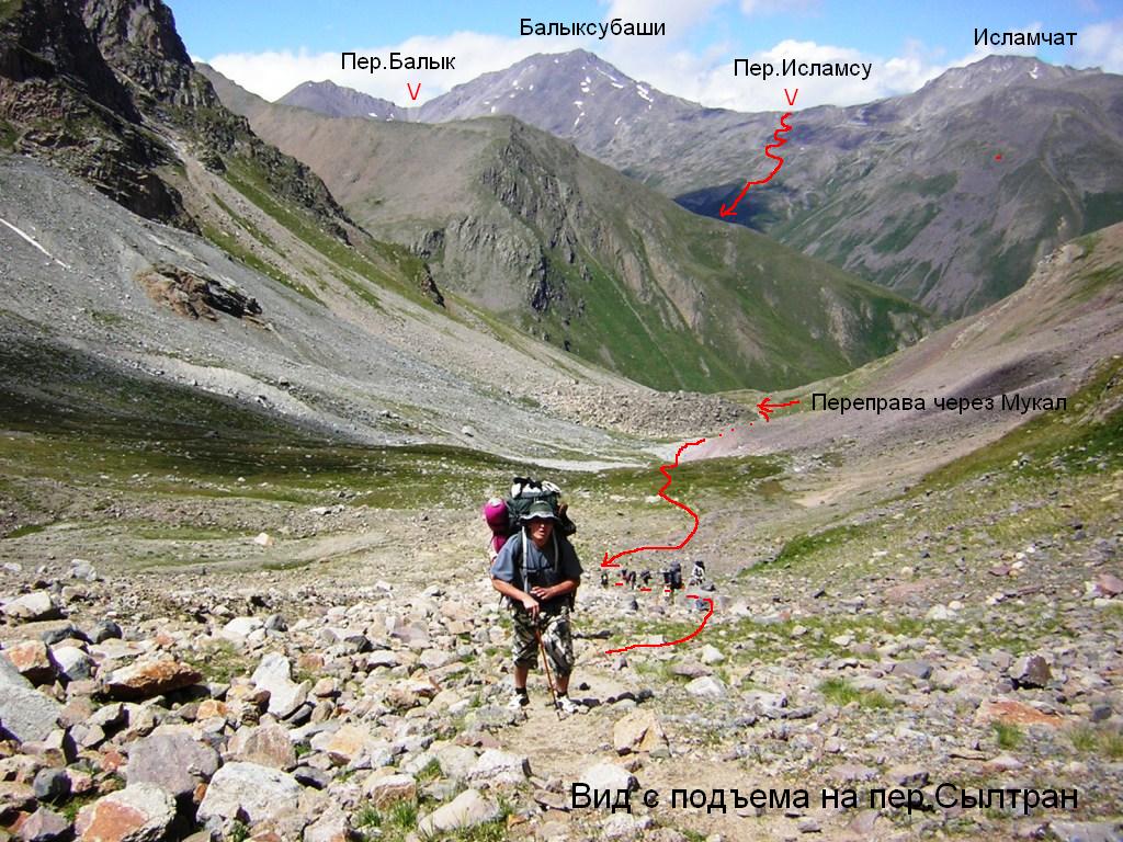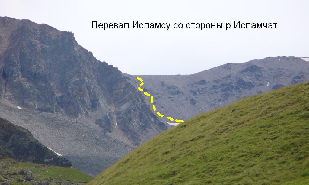 От места стоянки поднимаемся в предперевальный цирк, траверсируя более удобные правые по ходу склоны горы Балыксубаши. Выше 3000 м травянистые склоны сменяются осыпями различного калибра, тропа теряется. Перевал Исламсу находится в левой (восточной) части цирка, ближе к вершине Исламчат .