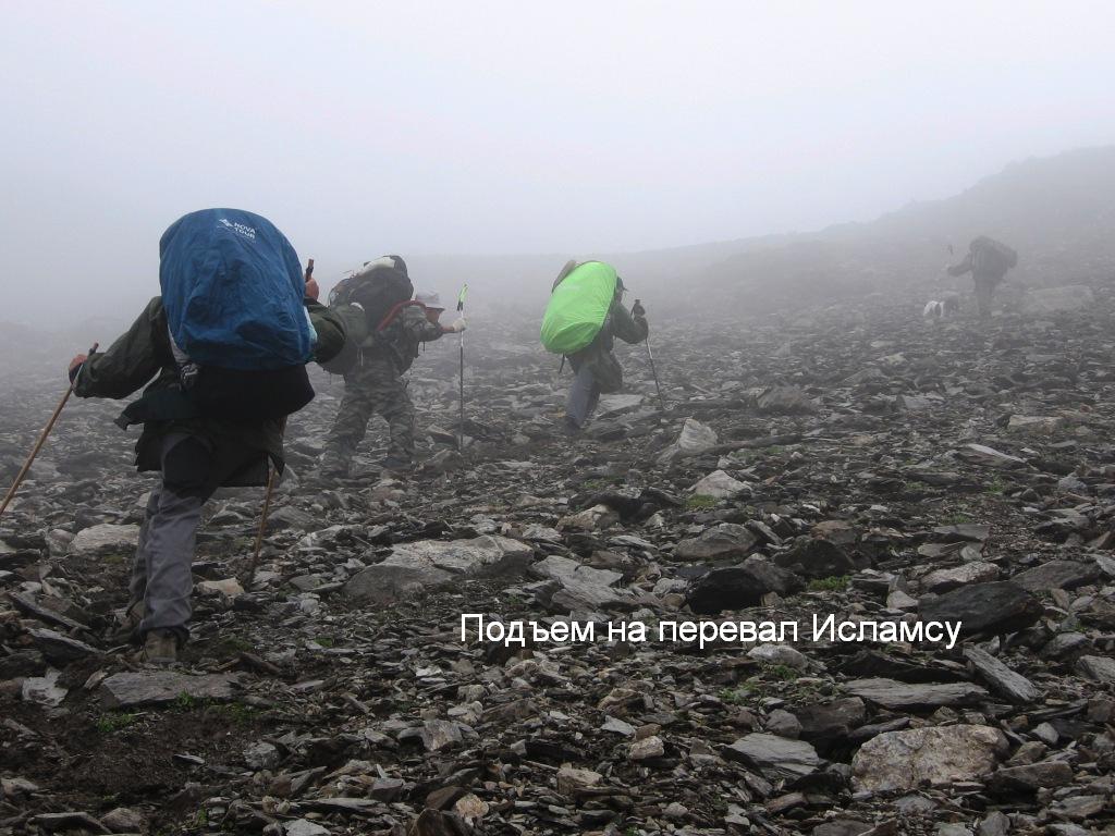 проходит по мелкой и средней осыпи, набита хорошая тропа. По мере приближения к перевалу крутизна нарастает, достигая на взлёте (около 200 м) 35-40°. Хорошо виден пройденный нами пер.Исламсу .