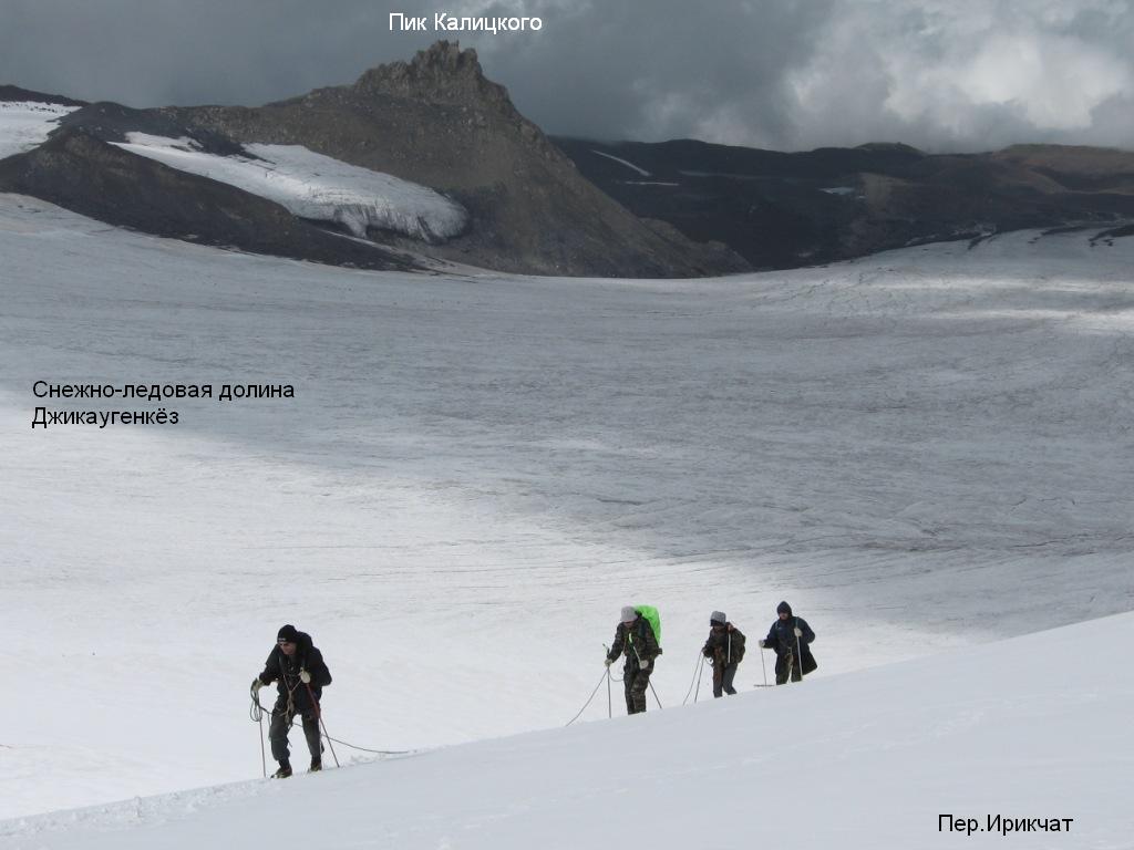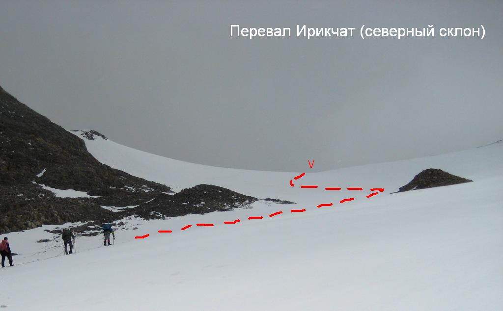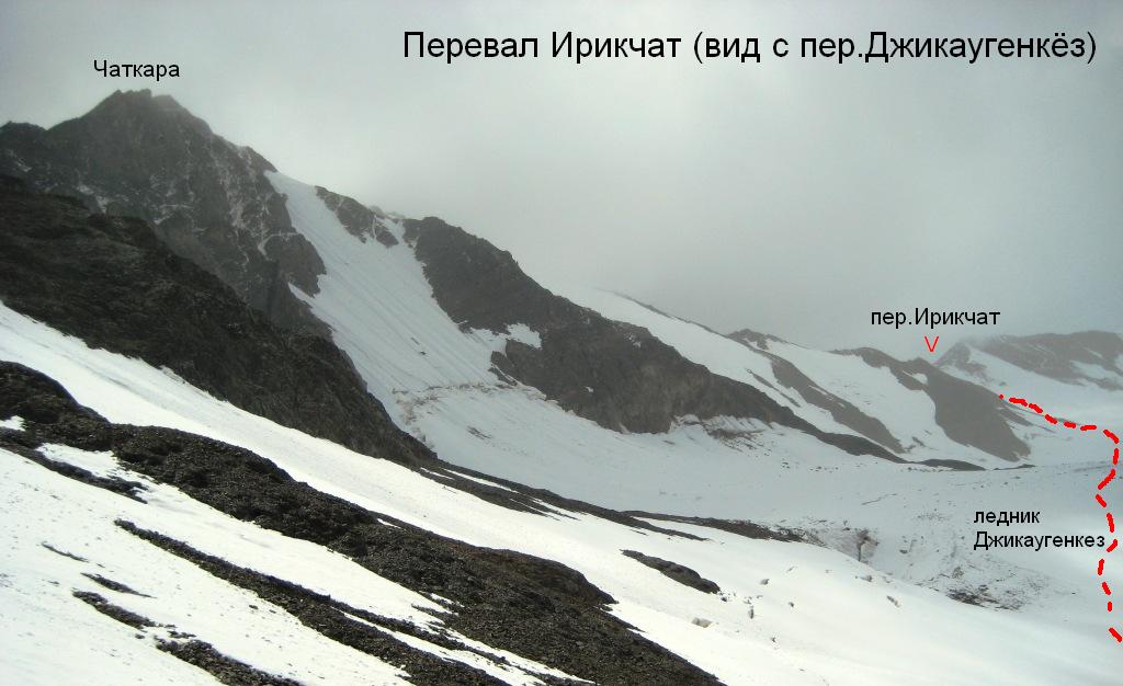 К подножью перевала Ирикчат идем около 2 км по относительно ровному, без трещин, леднику, присыпанному снегом и местами камнями, скатившимися со склонов Чаткары. Снежный взлёт с перепадом около 200 м в нижней своей половине некрутой (до 25°), но представляет собой закрытый ледник с трещинами.