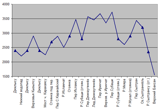 | 14.08 | р. Сылтрансу – пос. Верхний Баксан | 6 | – 800 | 1,5 | Тропа и дорога на некрутых травя нистых склонах | Ясно. 5-20°С |