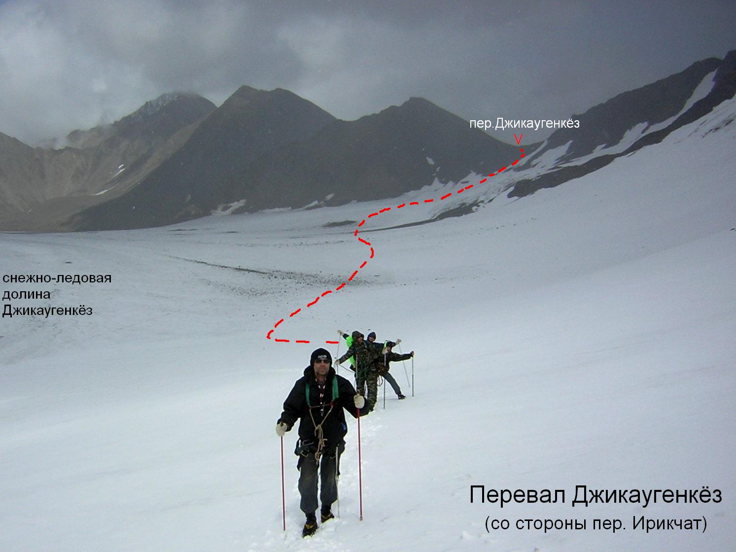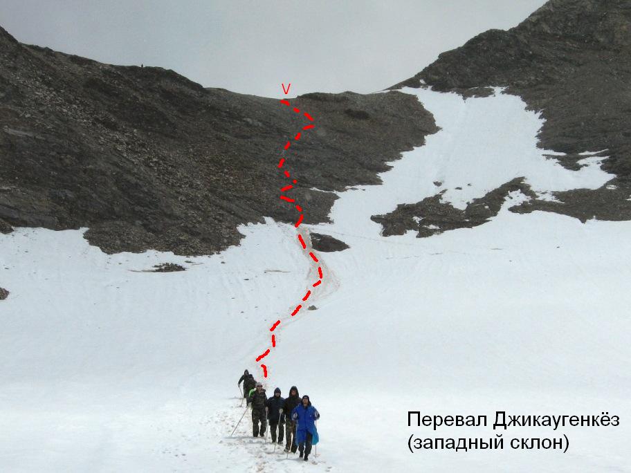 Спуск с перевала на снежно-ледовую долину Джикаугенкёз невелик по протяженности и перепаду высоты (около 100 м). Вначале мелкая крутая (до 45°) осыпь, затем снежный склон меньшей крутизны с плавным «выкатом» внизу.