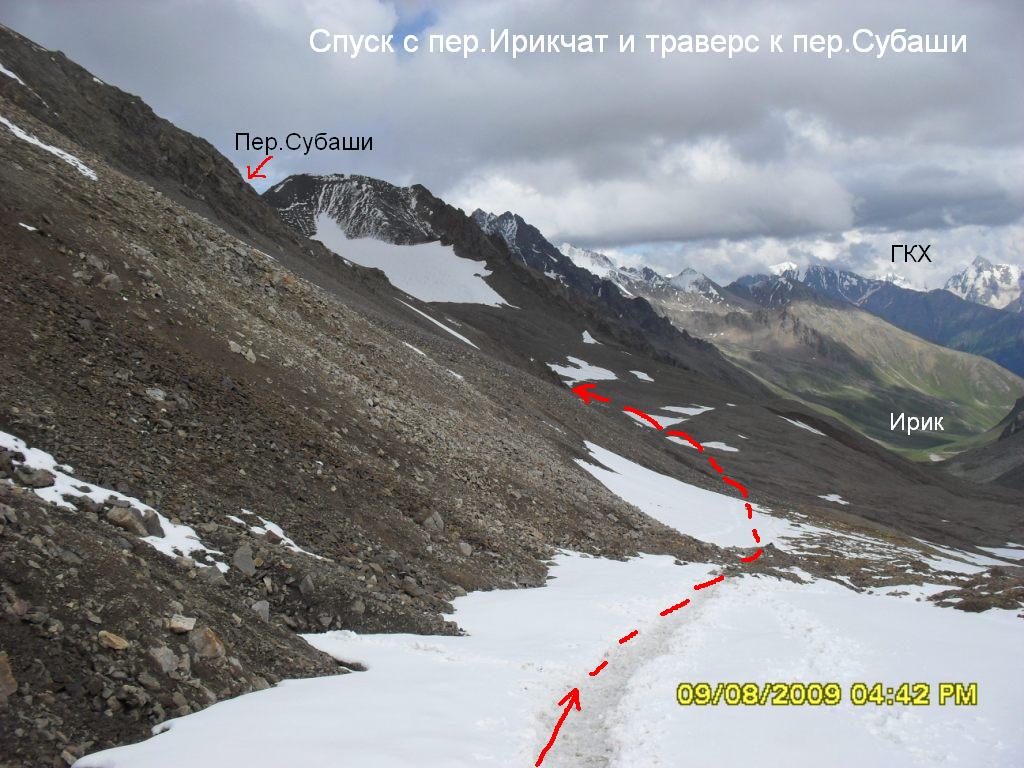 Спускаемся по крутой мелкой, затем средней осыпи (тропа) левее ледника Ирикчат. Ниже взлёта встречаются небольшие некрутые снежники. Нашей задачей на данный момент времени является подход под перевал Субаши с минимальной потерей высоты. Поэтому спускаемся до уровня последних скал на южном гребне Чаткары (высота около 3400 м), ниже которых возможен траверс по осыпи к цирку упомянутого перевала .