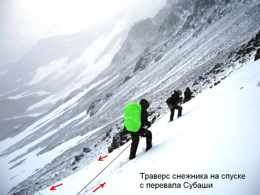 , расположенному между вершинами Чаткара и Субаши. В цирке пересекаем небольшие снежники. Спуск с Ирикчата и подход под взлёт перевала Субаши занял 1,5 часа. Из цирка перевал виден как достаточно протяженный участок хребта с несколькими понижениями, отделенными друг от друга скальными зазубринами. При этом трудно понять, какое из этих понижений является оптимальным для прохождения. Четкой и однозначной тропы на взлёте мы также не обнаружили. Взлёт представляет собой крутую (до 45-50°) мелкую и среднюю «живую» осыпь с выходами скал; набор высоты около 100 м. Необходимо соблюдение правил прохождения камнеопасных склонов. Преодоление взлёта заняло около 30 мин. Вышли на перевал в западной его части, ближе к вершине Чаткара. Тура не обнаружили. Участок перевала, на котором мы оказались, представляет собой узкий и достаточно острый скальный гребень, спуск с которого идет по осыпному кулуару, а затем по снежнику средней крутизны. В отчетах имелись указания на то, что более удобный и пологий спуск, вероятно, находится в восточной части седловины. Однако с нашей точки эта часть хребта не просматривалась (закрыта скалами), а переход туда представлялся проблематичным и небыстрым (опять же из-за скальных башен). Кроме того, наш выход на перевал совпал с резким ухудшением погоды (снижение температуры воздуха ниже нуля, сильный ветер, пурга). В условиях плохой видимости, обледенения скал и лимита времени (оставалось около полутора часов до темноты) принимаем решение спускаться непосредственно из точки выхода на перевал.