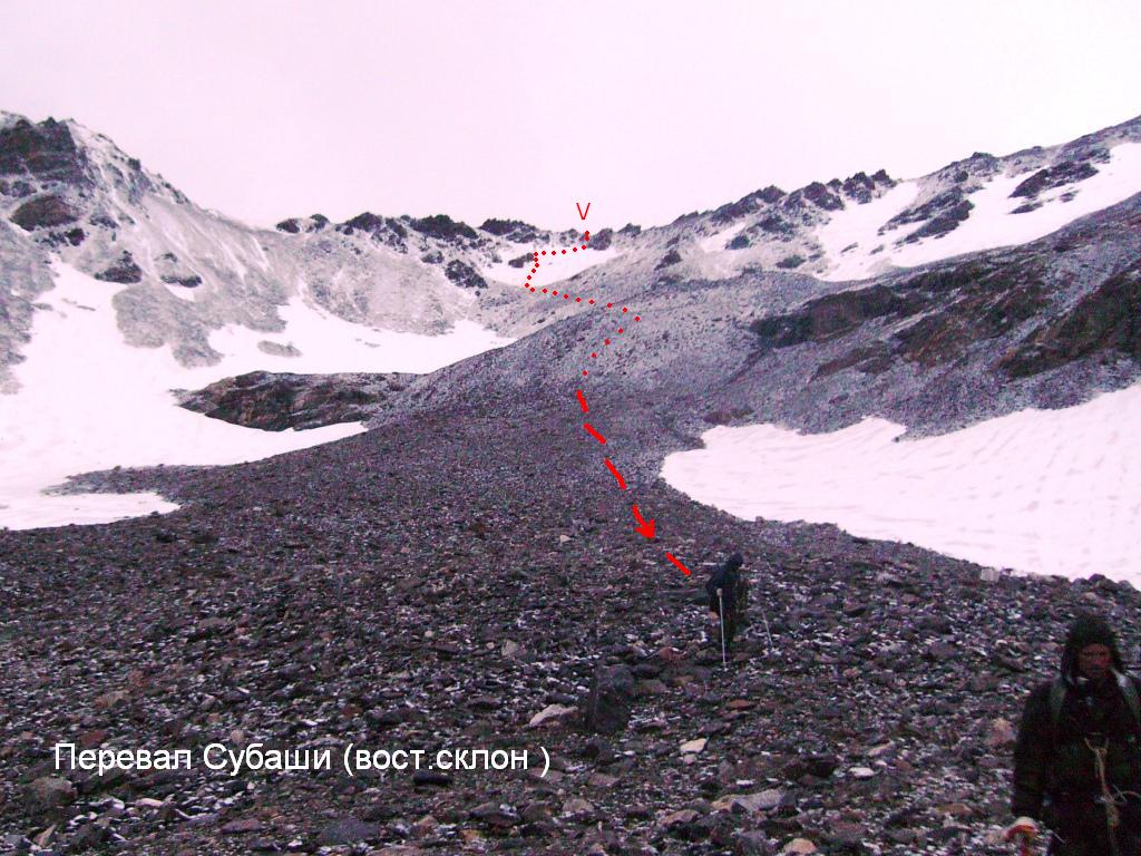 На уровне скал уходим с тропы влево и траверсируем по средней осыпи с плавным набором высоты в восточном направлении, практически кратчайшим путём к открывающемуся впереди перевалу Субаши