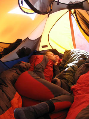 К вечеру перед штурмом запуржило. С первыми сумерками, накачавшись под завязку горячим чаем, мы завалились в палатку в надежде ухватить хотя бы малую толику сна. Вместо этого ухватили очередное приключение на ту самую многострадальную часть человеческого организма, которая без этих приключений, похоже, жить не может.