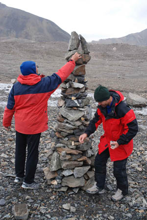 Эту тему я подсмотрел в Непале. А тут как на заказ выдался свободный денёк на морене — самое время собирать камни. Земляки поддержали почин, и к ужину нам удалась изящная конструкция высотой в человеческий рост. Остальные поначалу взирали на нашу возню недоумённо-скептически. Однако уже в пять утра после бессонной ночи первый из калининградцев вылез из палатки и нетвёрдыми шагами отправился искать подходящий камень для фундамента. С наступлением дня ряды строителей пополнились, и к вечеру напротив нашей пирамиды возвышался новый монумент, почти на полметра превосходящий её высотой.