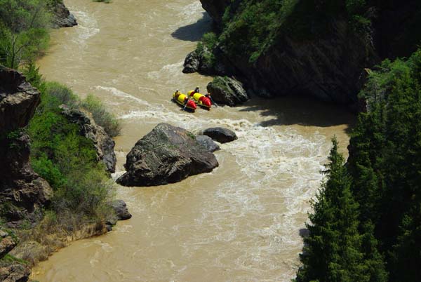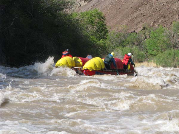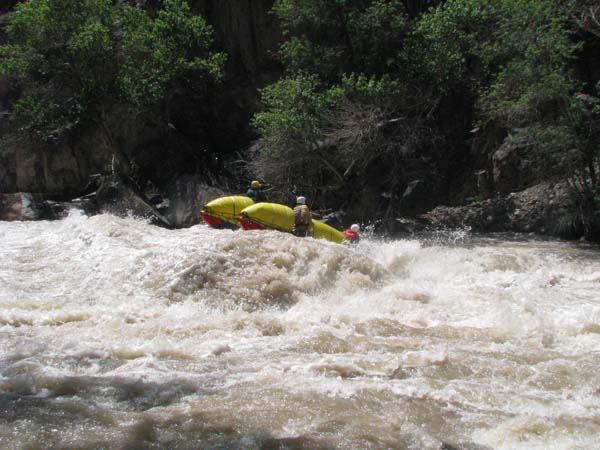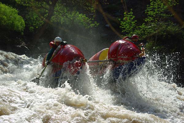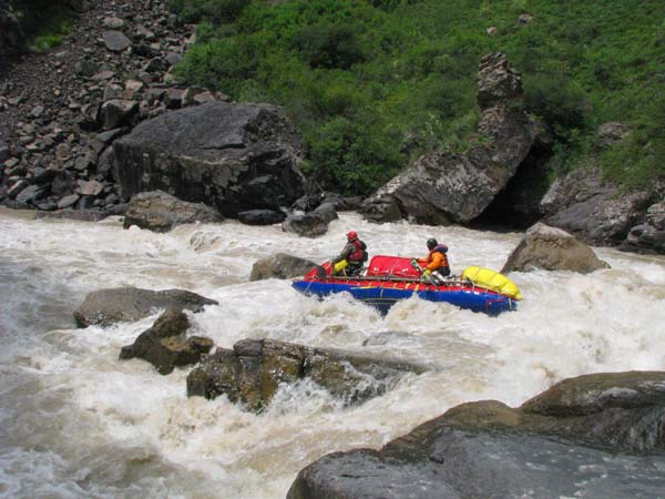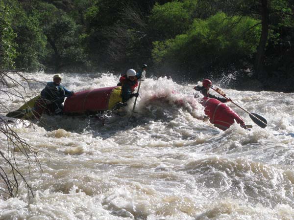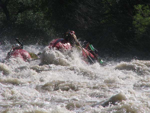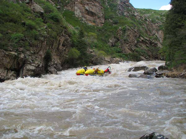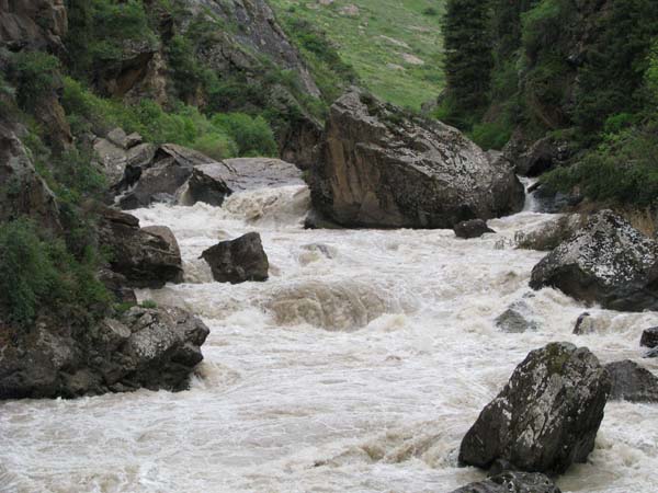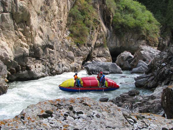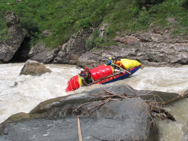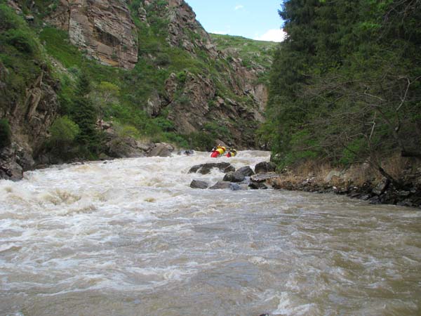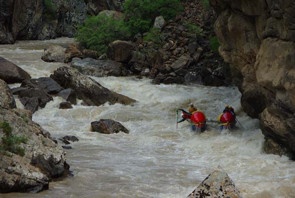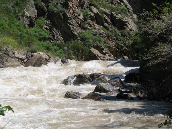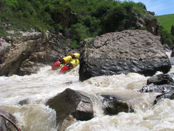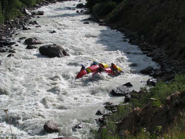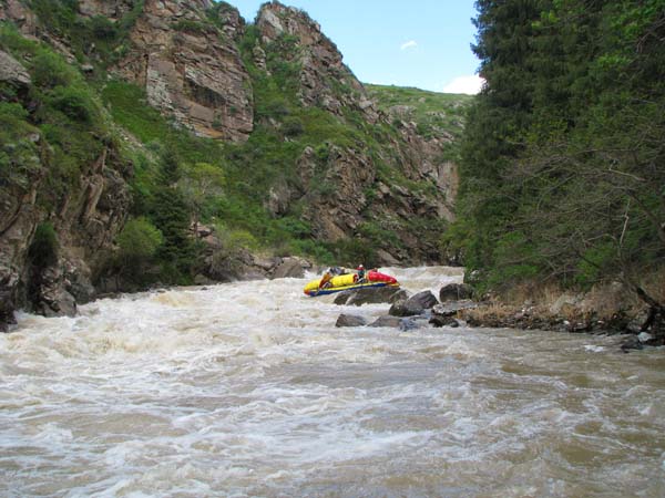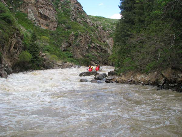 Когда в прошлом году мне предложили пойти на Майнак, я согласился не раздумывая. Уж очень хотелось проверить свои оценки и испытать ту энергетику необузданной реки с так и не покоренными порогами. Для раскатки в этот раз была выбрана классическая шестерка р.Чилик. На мой взгляд, почти идеальный вариант для отработки слаженности экипажей и тактики прохождения. Река имеет очень большой уклон и в условиях большой воды, заставила «впахивать» с первых же метров сплава. Неожиданностью для меня было отсутствие «теней» даже за большими камнями. Разница струй была, а вот «теней» и противотоков как таковых нет.