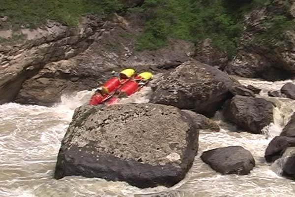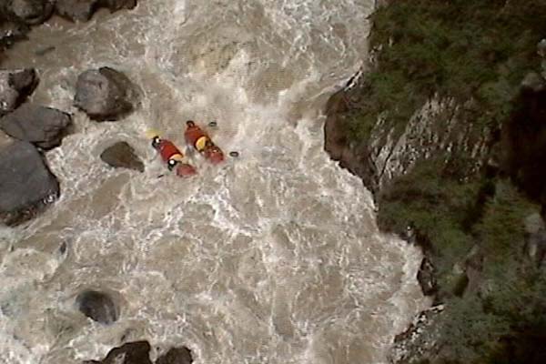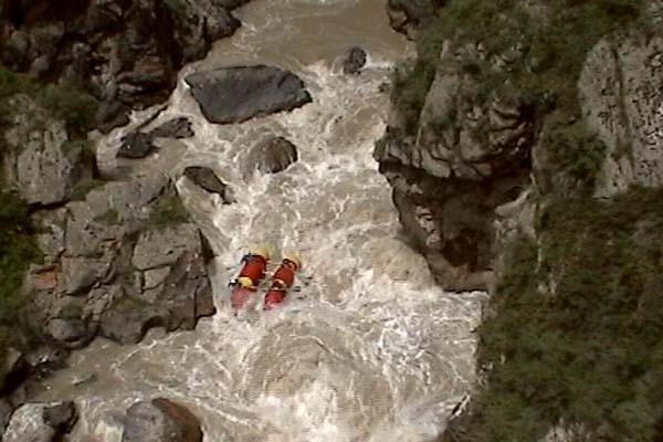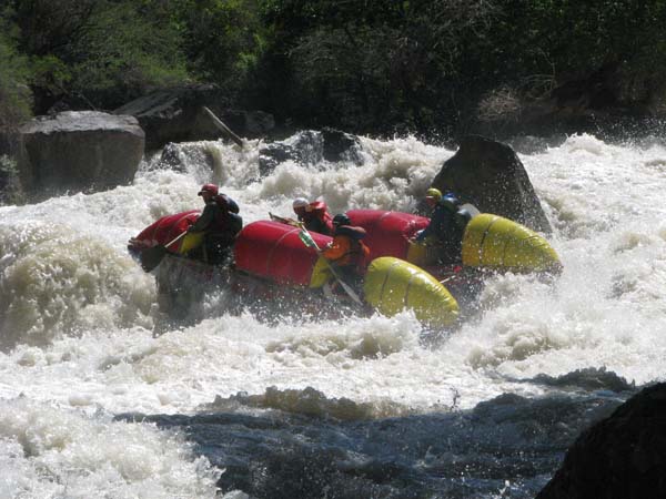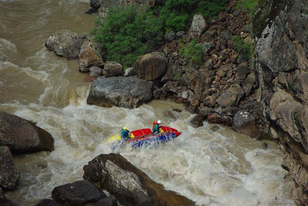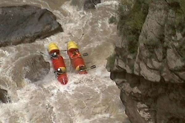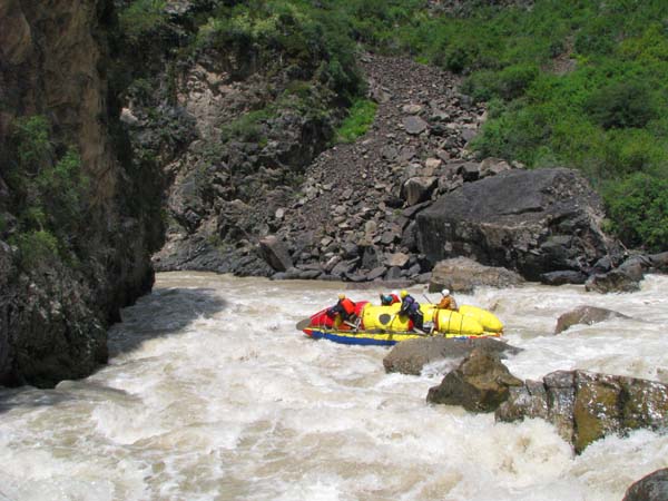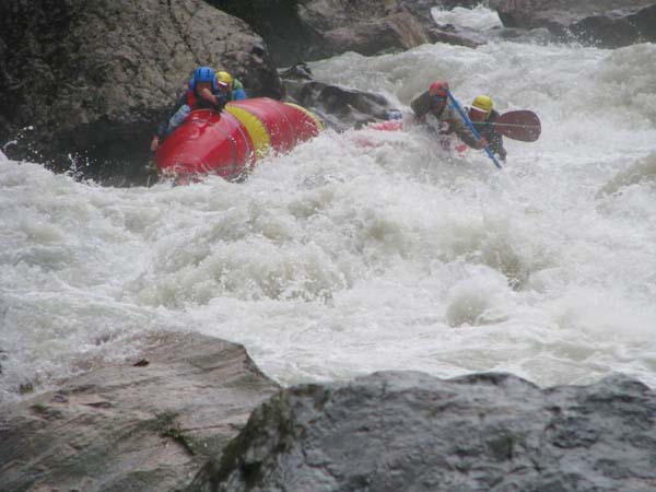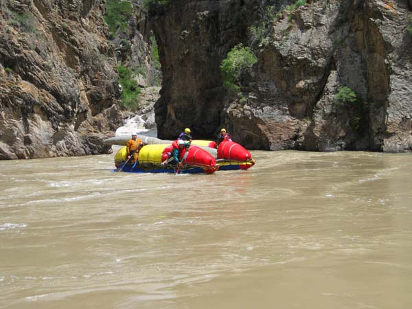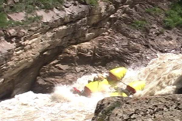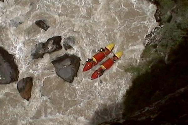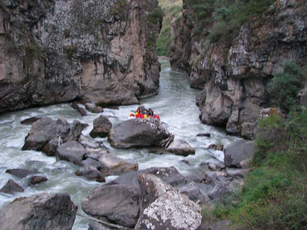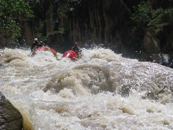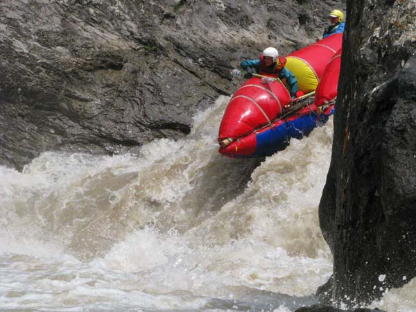 Первый экипаж стартовал и первый же порог «Добро пожаловать» встретил перекрученными струями и мощными бочками. Категорийность порогов по нашей воде 5С – 6А. Река мечется между отвесных скал. Характер препятствий однотипный: сливы между глыбами камней и прижимы к скалам на крутых поворотах каньона. Выходы наверх при аварийных ситуациях весьма проблематичны. Зато с каждым пройденным метром реки постепенно росла уверенность в своих силах, да и работа каждого из нас постепенно становилась работой экипажа — не надо давать лишних команд, и каждый понимает когда, что и как надо делать. С первого по пятый порог прошли за 7 минут на одном дыхании. Зачалились перед порогом «Два брата» передохнуть и осмотреть первую ступень.