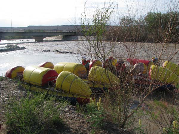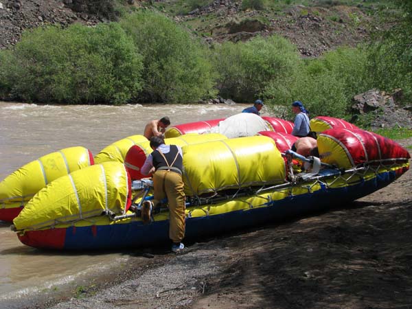Поэтому на р.Чарын мы приехали «в лучшем виде». Только вот с водой в этот раз нам крупно не повезло. Расход был кубов 30 не больше. Для наших «монстров» (я имею в виду катамараны, разработанные С.Таболиным для сплава по сложным рекам – длинна 6,5м., ширина 3м., объем 6м3, сплав в этих условиях оказался явно проблематичным.