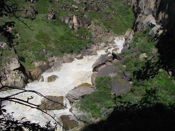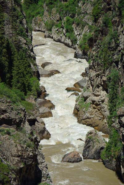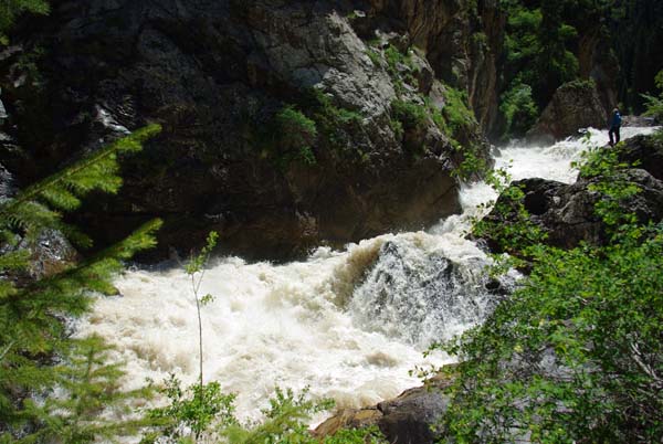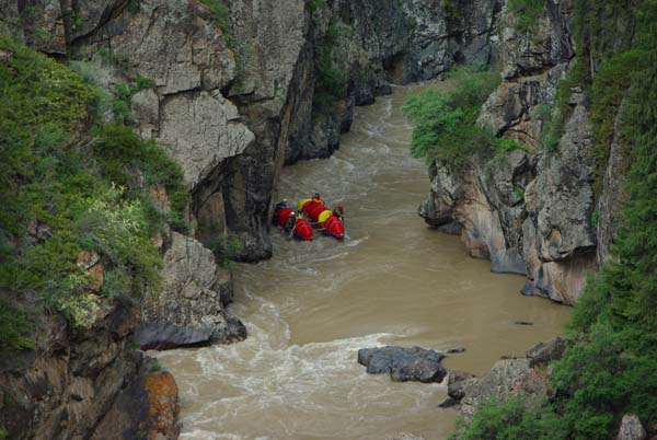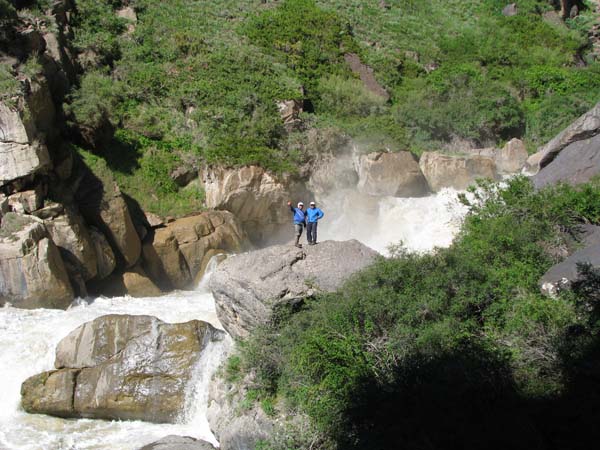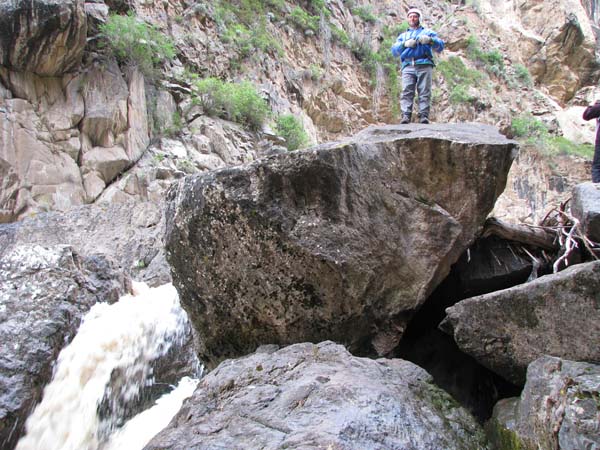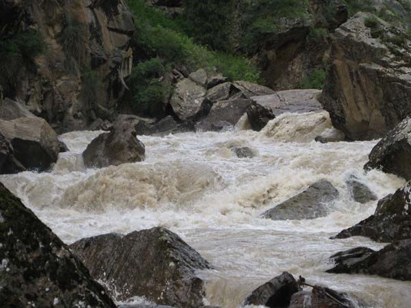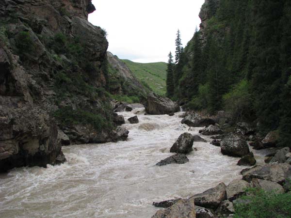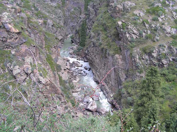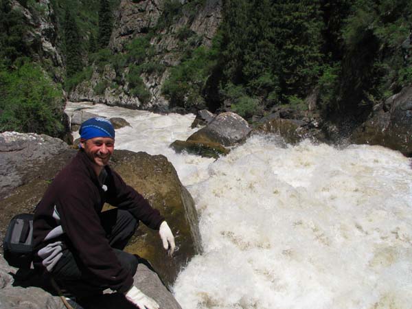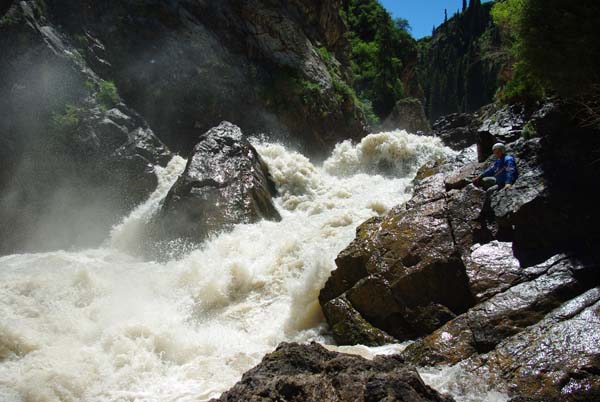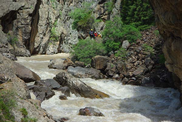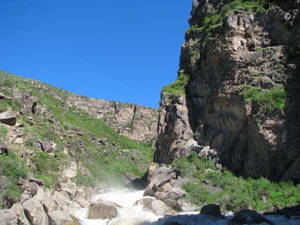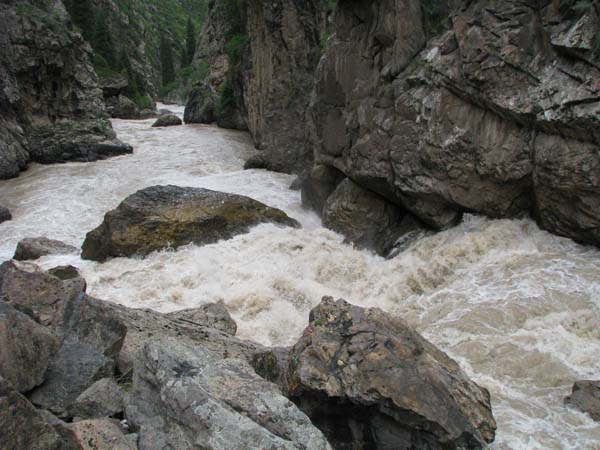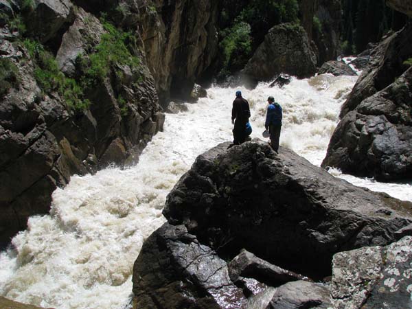 На следующий день Сергей и Серик отправились в деревню выяснять по поводу транспорта, а я Владимир, Макс и Гена пошли делать глубокую разведку от порога «Туши свет» до устья Шот-Мерке. Спуск к порогу «Туши свет» оказался очень проблематичен, но все, же нам удалось обойтись без навешивания перил. Панорама, которая нам открылась на порог, захватывала дух. Мы не обсуждали варианты прохождения (их не было), мы просто любовались этой мощью воды беснующейся в узких проходах между скал.