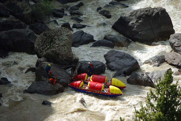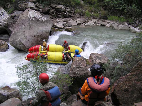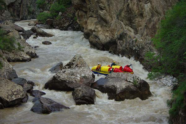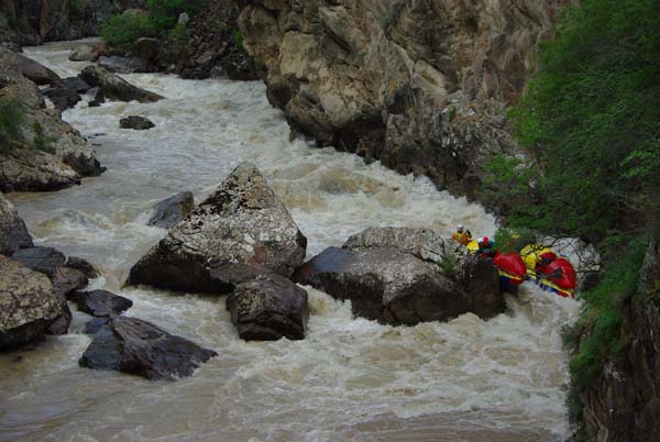 Мы подходили к порогу упирались в негабаритные проходы, как правило, на входе в порог, вылезали на камни, перетаскивали кат через огромные глыбы и шли дальше до следующего непрохода, а там все повторялось вновь. Ощущение опасности совсем притупилось. Ну что может сделать такая река с шестикубовым катом, у которого даже рама из 50 миллиметровых титановых труб.