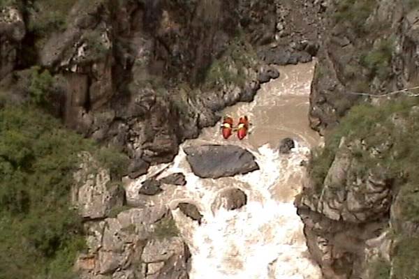 Все дальнейшие попытки вытащить катамаран из ловушки оказались тщетны. В этот момент опустилась плотная темнота. Экипаж первого катамарана разжег на выступе скалы костер, и ущелье озарилось красным светом, придавая и без того сложной ситуации окраску зловещей беды. На протяжении 4-5 часов поддерживался сигнальный костер на скале. Было сожжено все, что удалось найти на этом ограниченном куске берега. Первый экипаж также был отрезан от мира: вверх по реке отвесные скалы обрываются в воду, вниз по реке так же отвесные скалы, выход вверх невозможен без специального снаряжения, сплав невозможен, так как второй катамаран перегородил единственный проход. Но второму экипажу было намного сложней. Они находились в прижиме ночью даже без возможности сойти на берег. Часа три экипаж пытался пропихнуть судно в бутылочное горлышко, качая кат, дробя породу,