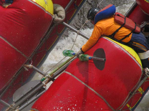 Затем были долгие спасработы по вытаскиванию катамарана из каменного плена. Но это никому не испортило настроение. Вечером в лагере было небольшое торжество по случаю удачного старта, а на следующий день ремонт второго катамарана. При ударе о скалу в первой ступени «Два брата» раму сложило по диагонали, прыжок через камень стоил среднего потдува правой гондолы, который вымыло еще перед порогом №7, в котором он безвозвратно затонул. Пришлось выправлять и перевязывать раму, чинить шкуру, а главное вновь клеить потдув из гермоемкостей. Ремонт продлился до позднего вечера и в базовый лагерь вернулись уже затемно.