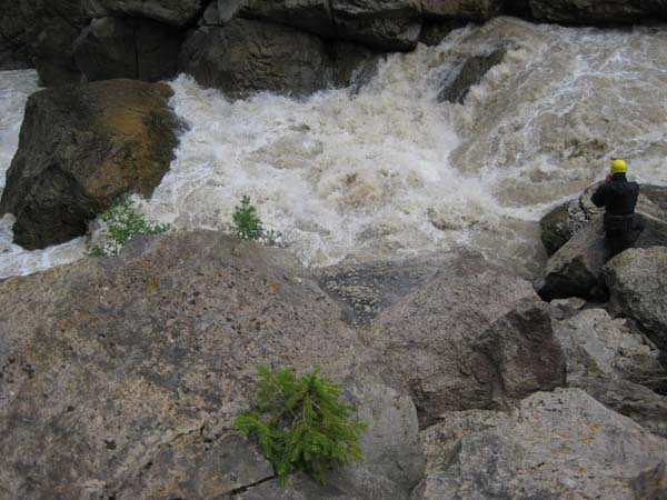 Раскачали почти до звона катамаран, надули спасжилеты, на сколько это было возможно, проверили посадку и в путь. Страховка была расставлена следующим образом: двое под водопадом (спасконец и съемка), один над «Цитаделью» (съемка и контроль всех членов экипажа в аварийной ситуации), и один на стрелке с р.Орто-Мерке у базового лагеря (спасконец и съемка). Как я уже писал, рассчитывать необходимо было только на себя и свой экипаж. Заход в «Ангар» достаточно прост. Разгоняем кат. Разгружаем носы над сливом