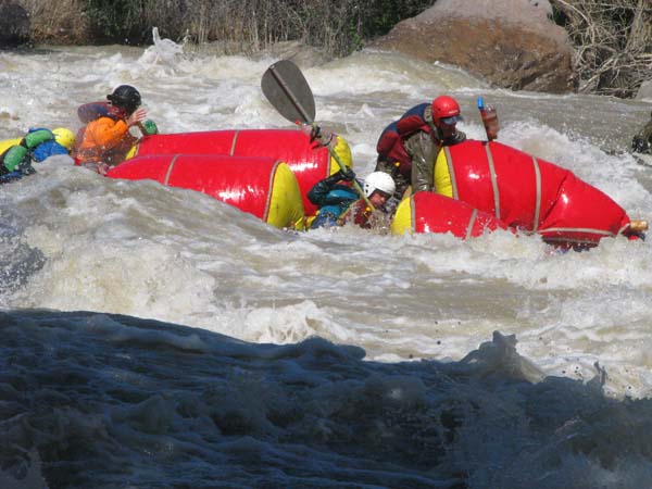 Когда стало светать, ребята догадались снять диагональ и, сложив раму параллелепипедом пропихнуть кат через узкое место. Дальнейший сплав я смотрел с замиранием сердца. Когда основная часть порога была уже пройдена, на выходе катамаран опять застрял на выходной гребенке.