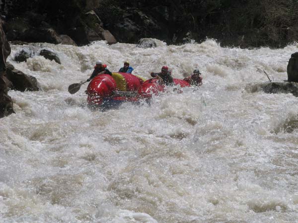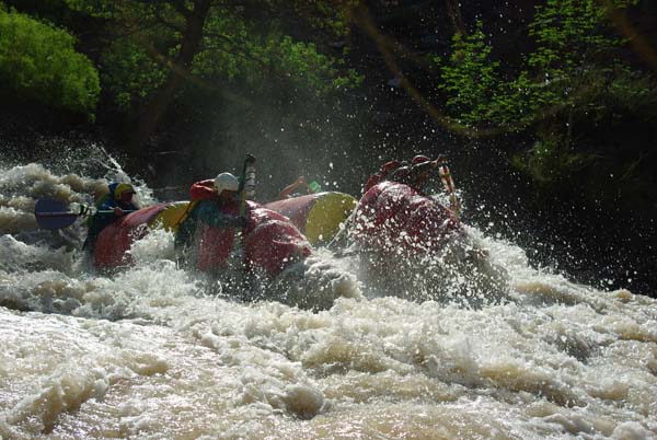 То, что нас встретило впереди трудно описать. С первым же сливом река набрала бешеную скорость и понесла вперед. Корректировать линию движения не представлялось возможным, да в этом и не было большой необходимости, главное было успеть обработать все сливы и бочки и не встать лагом. Каждый слив был мощнее предыдущего, нас накрывало с головой.