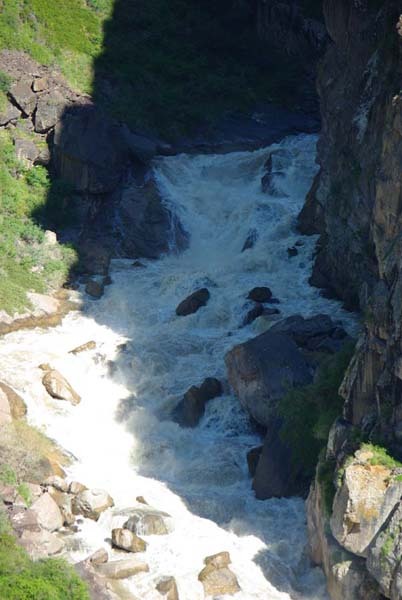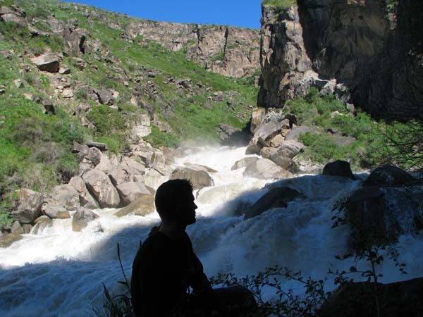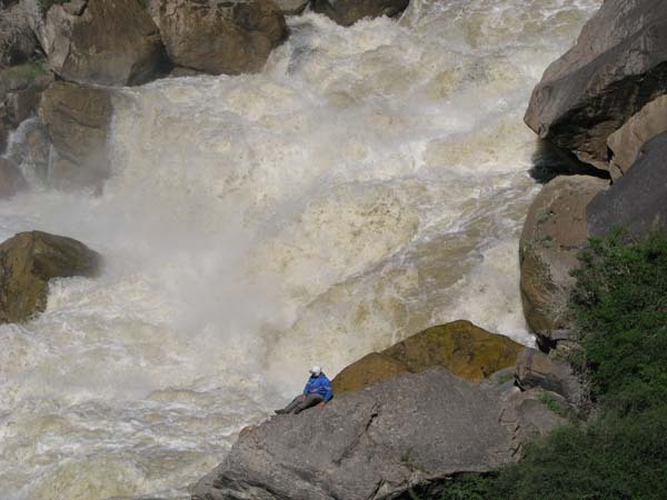 На следующий день Сергей и Серик отправились в деревню выяснять по поводу транспорта, а я Владимир, Макс и Гена пошли делать глубокую разведку от порога «Туши свет» до устья Шот-Мерке. Спуск к порогу «Туши свет» оказался очень проблематичен, но все, же нам удалось обойтись без навешивания перил. Панорама, которая нам открылась на порог, захватывала дух. Мы не обсуждали варианты прохождения (их не было), мы просто любовались этой мощью воды беснующейся в узких проходах между скал.