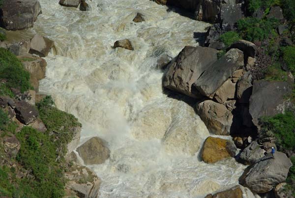 - В-четвертых, есть лишь одно место, где можно поставить береговую страховку нашими силами – перед второй ступенью на левобережных камнях. Но не факт, что удастся попасть в левую струю и уж тем более схватить спасконец в этой «мясорубке». Горький опыт предыдущих групп показал, что даже по средней воде человек ушедший под слив водопада выныривал где-то перед самым входом в «Цитадель».