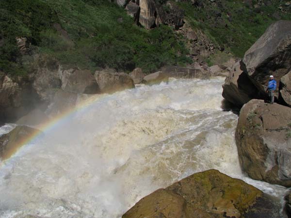 После увиденного мы не стали тратить время на детальную разведку порогов, а направились сразу к каскаду «Подкова». Спуск к водопадам «Подковы» не назовешь легким, но мы также сумели обойтись без веревок. Мощь и красота водопадов не поддается описанию. Надежда на то, что по большой воде откроются проходы, не оправдалась. Проходов там более чем достаточно и линий движения можно предложить несколько. Но нужно быть совсем «отмороженным» чтобы всерьез рассматривать варианты прохождения. Лучше просто стоять и любоваться величием творения матушки природы.