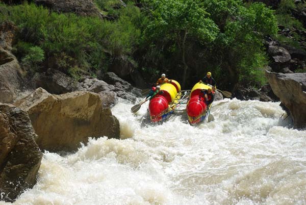 Когда в прошлом году мне предложили пойти на Майнак, я согласился не раздумывая. Уж очень хотелось проверить свои оценки и испытать ту энергетику необузданной реки с так и не покоренными порогами. Для раскатки в этот раз была выбрана классическая шестерка р.Чилик. На мой взгляд, почти идеальный вариант для отработки слаженности экипажей и тактики прохождения. Река имеет очень большой уклон и в условиях большой воды, заставила «впахивать» с первых же метров сплава. Неожиданностью для меня было отсутствие «теней» даже за большими камнями. Разница струй была, а вот «теней» и противотоков как таковых нет.