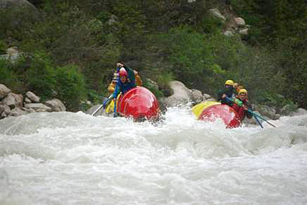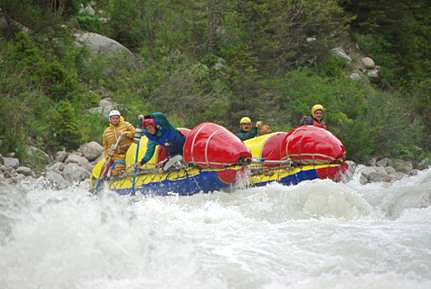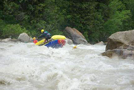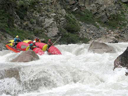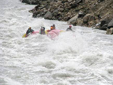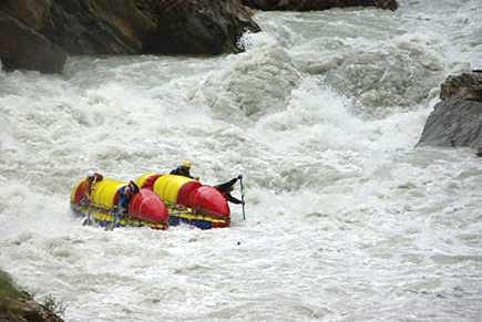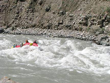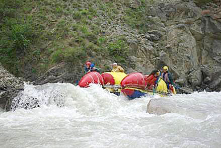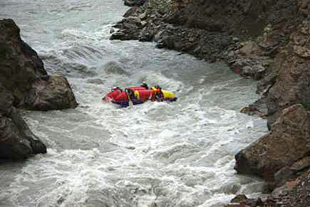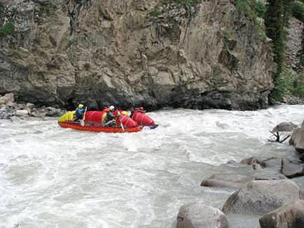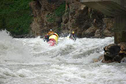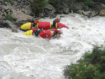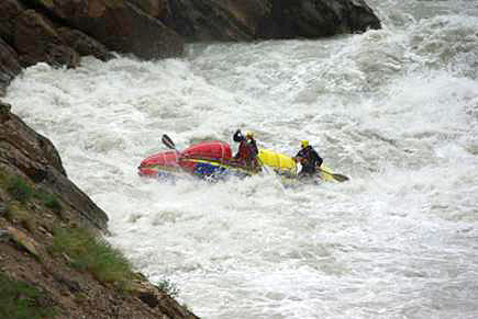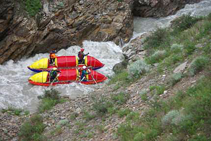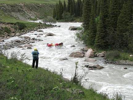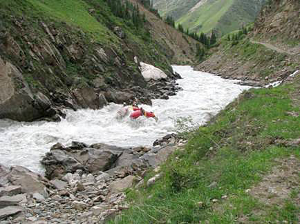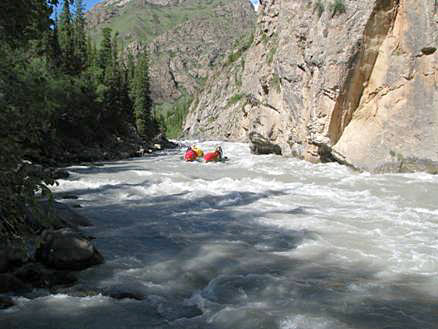 Первой рекой связки была выбрана классическая пятерка р.Чонг-Кемин. Уже на заброске местные гиды, катающие на рафтах по низовью реки коммерческие группы (в основном американцев) сообщили, что вода очень большая и нам придется туго. Вода была не просто большая, а паводковая. Каждый день шел дождь, и снег в горах до конца не стаял.