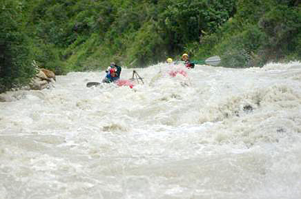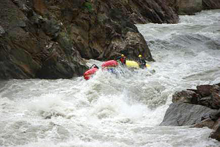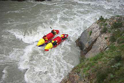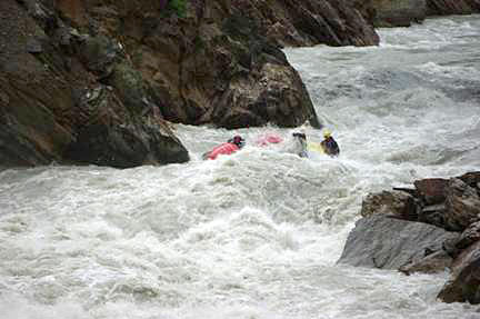Река бесновалась, пытаясь размазать катамаран по стенам. Когда же скалы сошлись до узкого коридора в 8 метров, стало совсем тяжко. Не было ни секунды на раздумье, приходилось работать на пределе сил, только успевая доворачивать катамаран в сливы на выходах из прижимов. (фото 42-44)