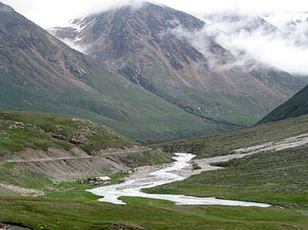 Эта часть маршрута мне была уже знакома. Двадцать лет назад я руководил группой успешно прошедшей этот маршрут по малой воде. За 20 лет много что изменилось. Заброску пришлось делать не через перевал Б…. , а заезжать с низу. Добраться удалось только до горячих сероводородных источников Джилусу (фото 23). Не доезжая 300 метров, дорогу размыла сель, и восстанавливать ее ни кто не собирается. На источники нам приходилось ходить вброд.