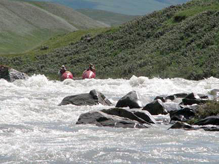 Хочется сделать маленькое отступление и пояснить организацию похода. В настоящее время все больше групп при подготовке маршрута стали пользоваться услугами туристических фирм находящихся в этом регионе. Так поступили и мы. В аэропорту нас встретил комфортабельный микроавтобус, который сопровождал нас при сплаве по Чонг-Кемину и М.Нарыну. По Б.Нарыну сквозного проезда нет, поэтому после заброски автобус вернулся в Бишкек и приехал в назначенное время в условленное место. Помимо организации автотранспорта туристическая фирма взяла на себя проблемы с оформлением разрешения на въезд в погранзону и в заповедники. В целом более комфортных условий сплава я даже не припомню. Большую часть маршрута мы прошли на разгруженных катамаранах, при переездах на новую реку заезжали на Иссык-Куль, где останавливались в полупустых санаториях и принимали радоновые ванны, здорово заживляющие незначительные раны и царапины, неминуемо возникающие в процессе осмотра препятствий и сплава.