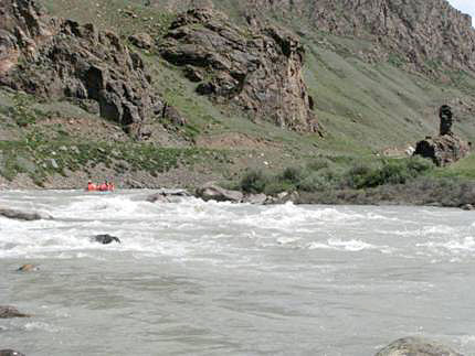 В р.Джилусу воды оказалось очень много. Явно шел паводок. Расход около 50 куб. м. в сек. Характер препятствий – мощные шиверы валы 5 к.с. ( Фото 24). После слияния с р.Бурхан река носит название Болгарт, а после слияния с р.Арчалы собственно и начинается Малый Нарын.