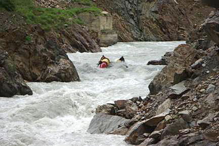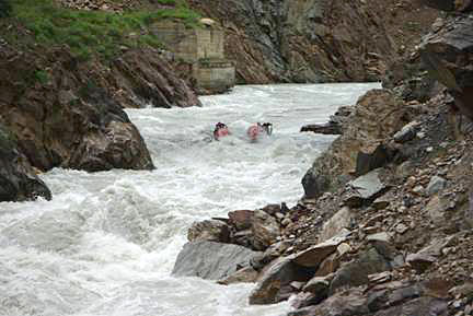 это место было самым проблемным. Нет, конечно, и другие участки каньона были сложны, но это место (мы его прозвали «Золотым руном») было смертельно опасно и технически очень сложно. Необходимо было пройти 3-х метровый слив, тормознуться в конце его и оседлав косую бочку сделать по ней кормовой траверс от правого берега к левому. Такие номера иногда устраивали постановщики трасс на соревнованиях по ТВТ ранга Чемпионата СССР то на них всегда нападали участники, считая, что подобного в условиях реального похода быть не может. А тут единственно возможный вариант прохождения. Если тебе не удастся тормознуться, то придется проходить справа от огромного обломка скалы в русле и неминуемо тебя затащит в ферму моста, валяющуюся вдоль правого берега в основном потоке.