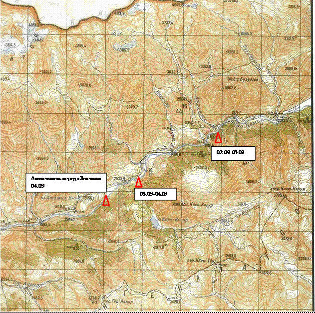 антистапель перед «Зеленым» 42.784630 N, 76.370181 E. высота 1990 м. Пройдено 2 км.