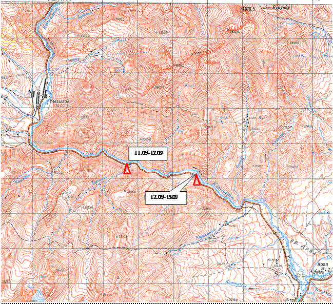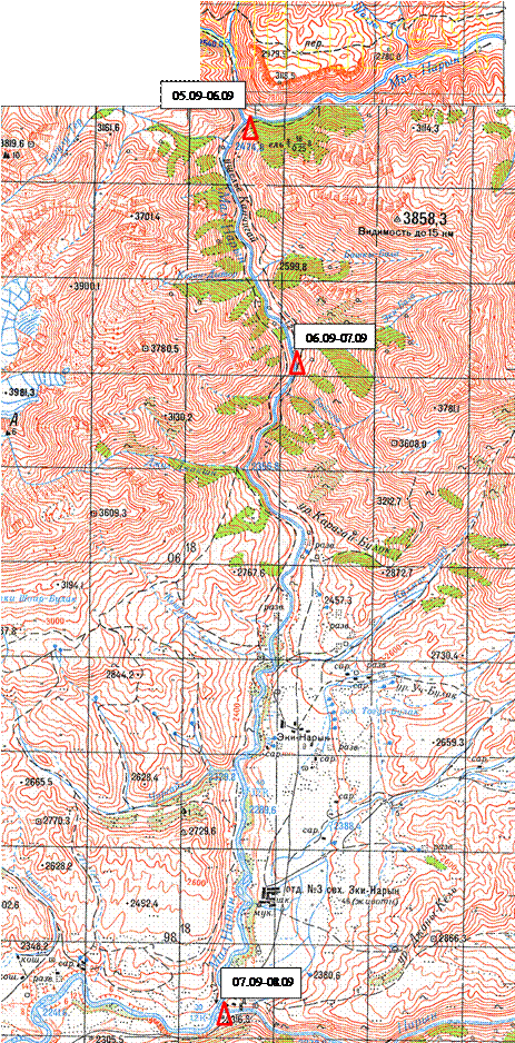 Фактическая: Рязань (машина) – г. Москва(самолет) – г.Бишкек (машина) — река Чонг – Кемин ( ниже 3 км. притока Джинды –Суу)(сплав) – р.Чонг Кемин ( перед началом 7ого каньона) (машина)-р. Малый Нарын( ниже слияния р.Болгарт и р.Кара-Каман) (сплав)- стрелка с р.Нарын(машина)- р.Кекемерен( выше п.Прорыв)(сплав)-пос.Арал(машина)- оз.Иссык-Куль(при наличии времени)- г.Бишкек (самолет)- г.Москва (машина)- г.Рязань. Курсивом выделено различие в заявленной и фактической нитке маршрута.