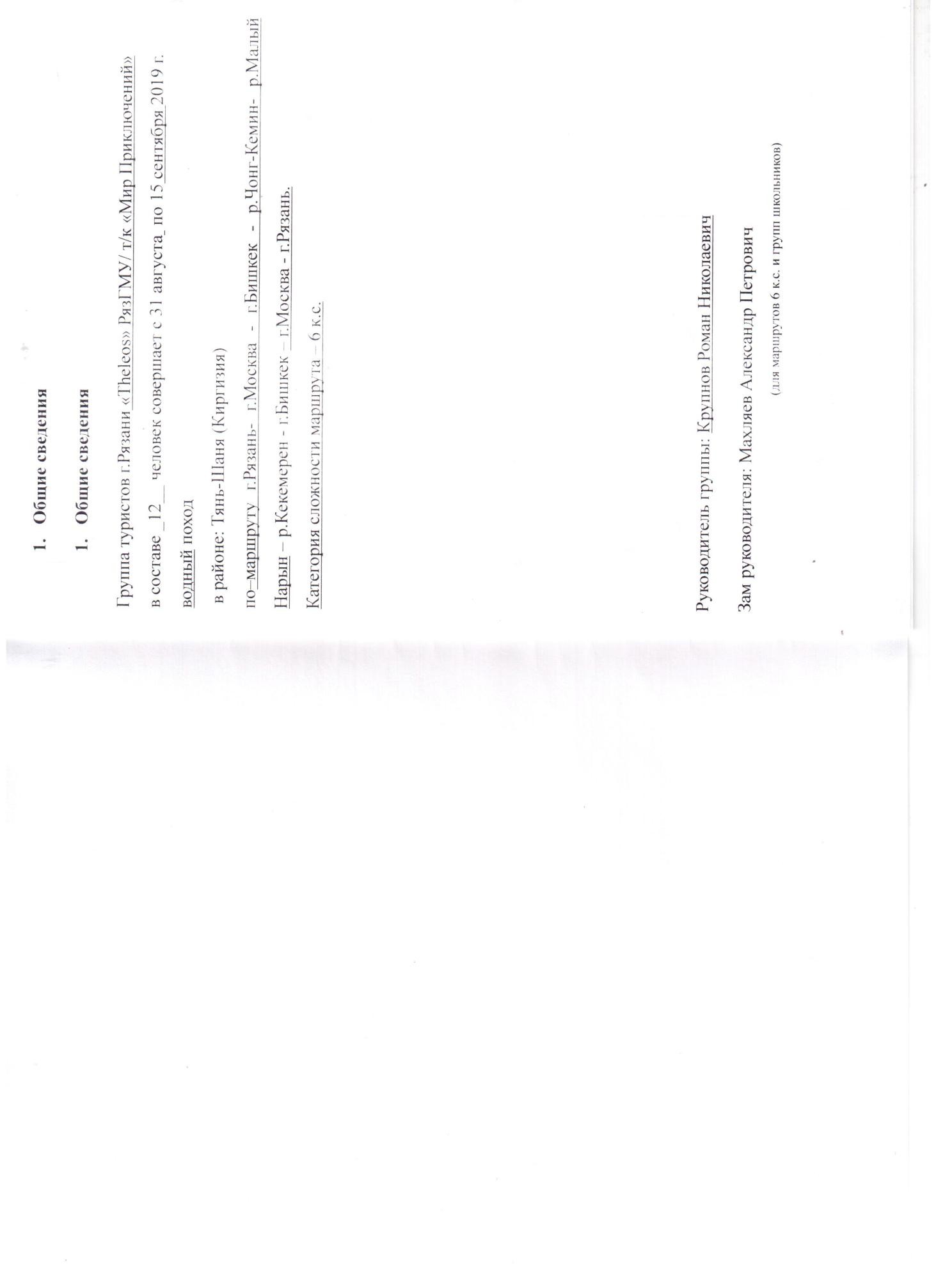 | Водный | Шестая (6) | 27 /52 /36– 115 сплав 12- пешком Итого 127 км | 16 | 12 | с 31.08.2019 г. по 15.09.2019г. | Чонг Кемин, Малый Нарын, Кеке мерен средний уровень. |