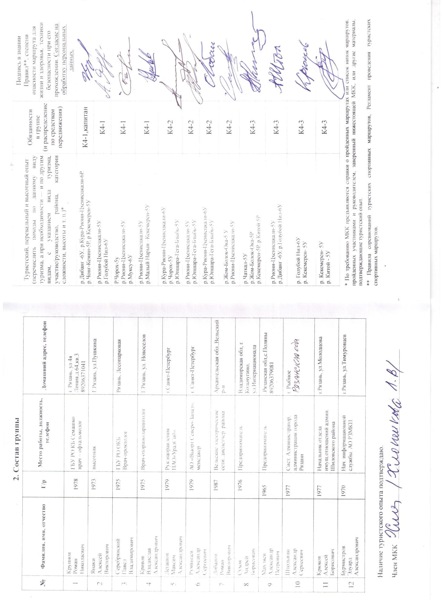 | 1 | Крупнов Роман Николаевич, Рязань | 1978 | р.Дибанг -6У. р.Кура — Риони — Цхенисцкали 6Р, р.Чонг-Кемин-5Р, Чорох-5Р, р.Кекемерен-5У | К4-1,капитан, руководитель |