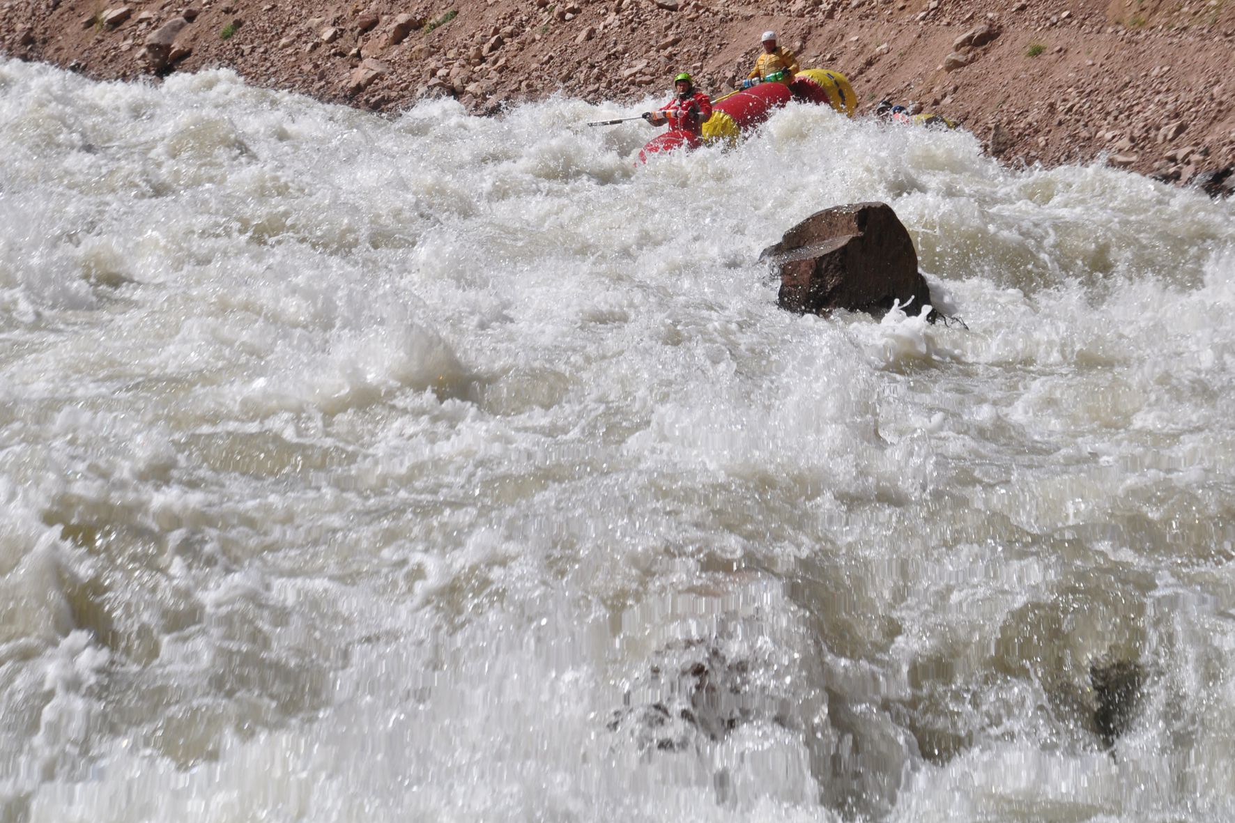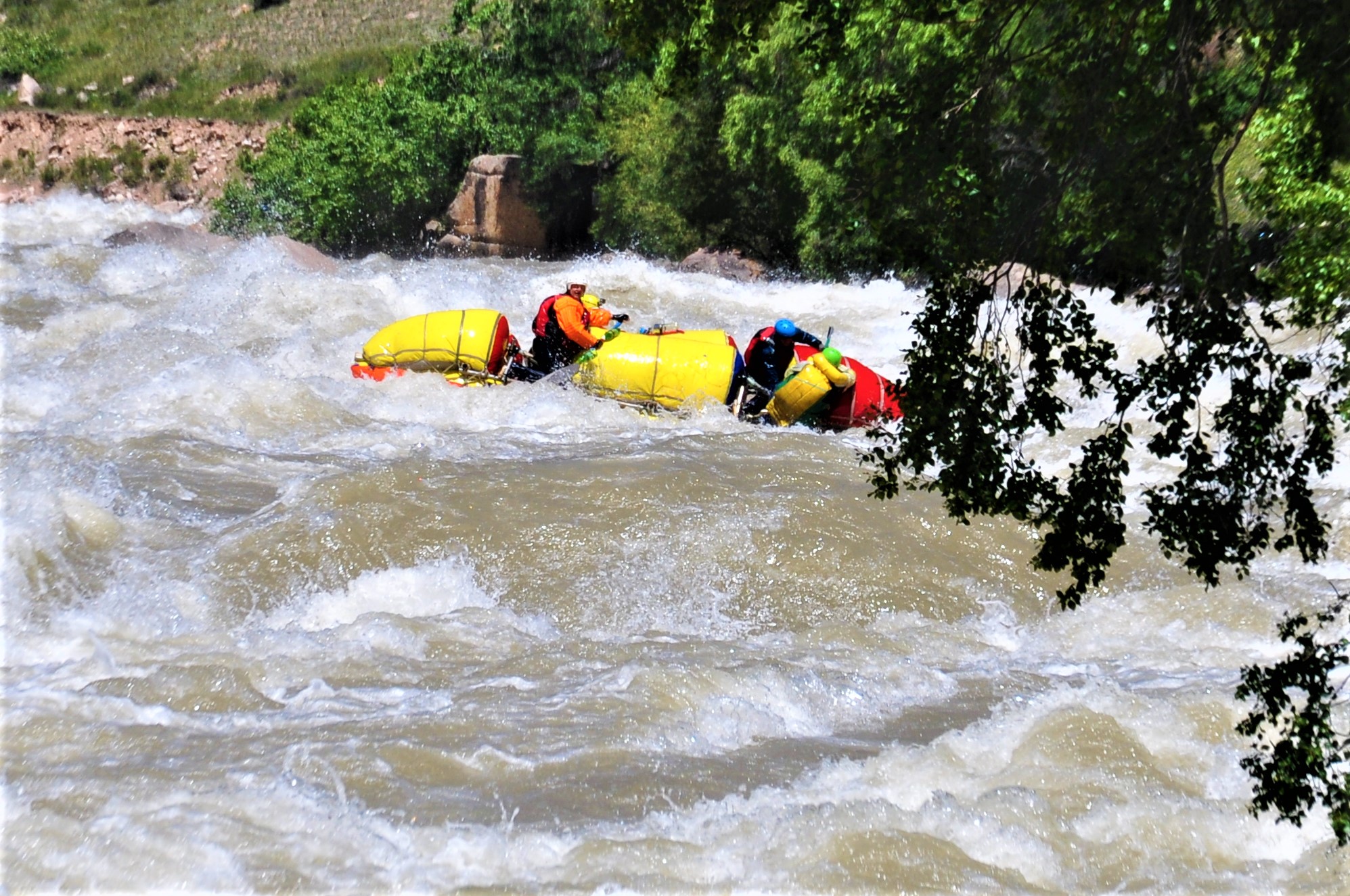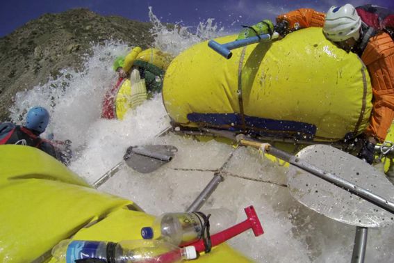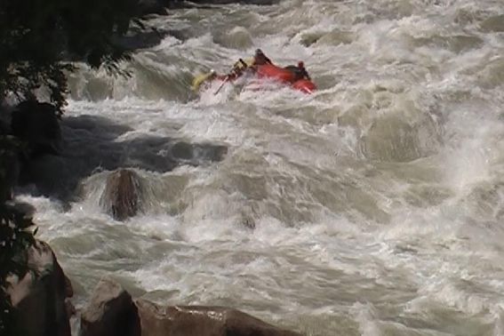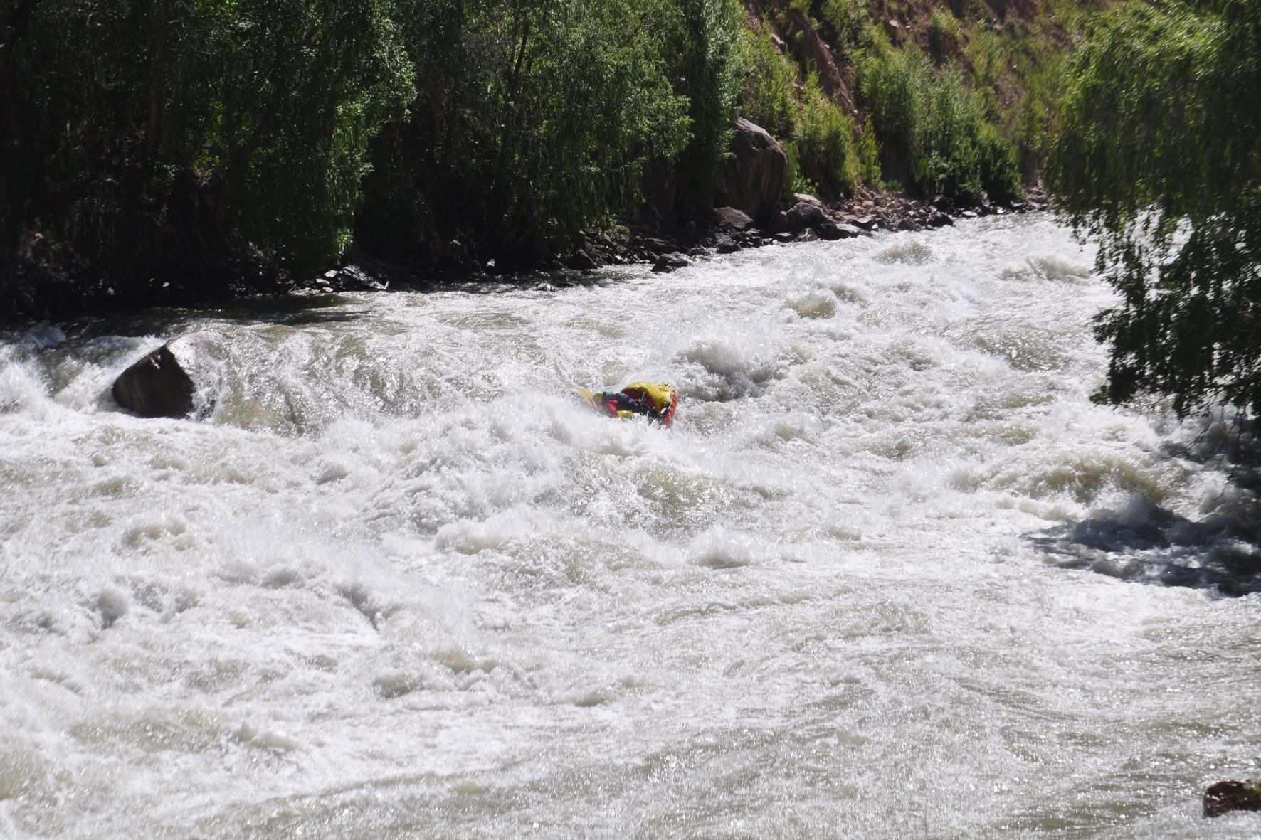 Оставшуюся часть до намеченной чалки ребята шли уже уверенно, несмотря на то что после первого слива порога №3 судно попало в жуткий «котел» и на несколько секунд полностью скрылось в пене. По счастью из «котла» их, совсем ошалевших, выбросило к левому берегу, куда, собственно, они и должны были попасть. Чалку экипаж провел успешно и пришел менять нас на страховке.
