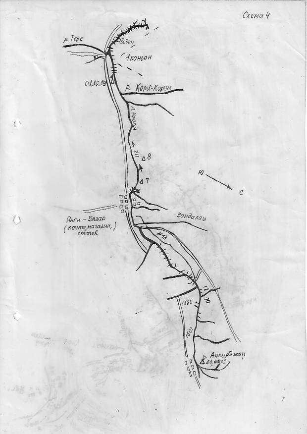 До начала маршрута добирались поездом 65 часов. Стоимость билета в купейном вагоне 31 руб. Из Рязани поезд отправлялся в 03ч. 25.09.89г., прибыли в Джамбул 25.09.89г. в 19ч.30м. Переночевав на автостанции, утром 26.09 мы отправились рейсовым автобусом до п.Кировка . В Кировке договорились с водителем КАМАЗа о заброске на Чаткал (12руб. с человека). Дорога на машине заняла 3,5ч., с остановками на несколько минут у каменной юрты под перевалом и на самом перевале. В 13ч.30м. мы прибыли к началу водной части маршрута , устью р.Кара-Кисмак.